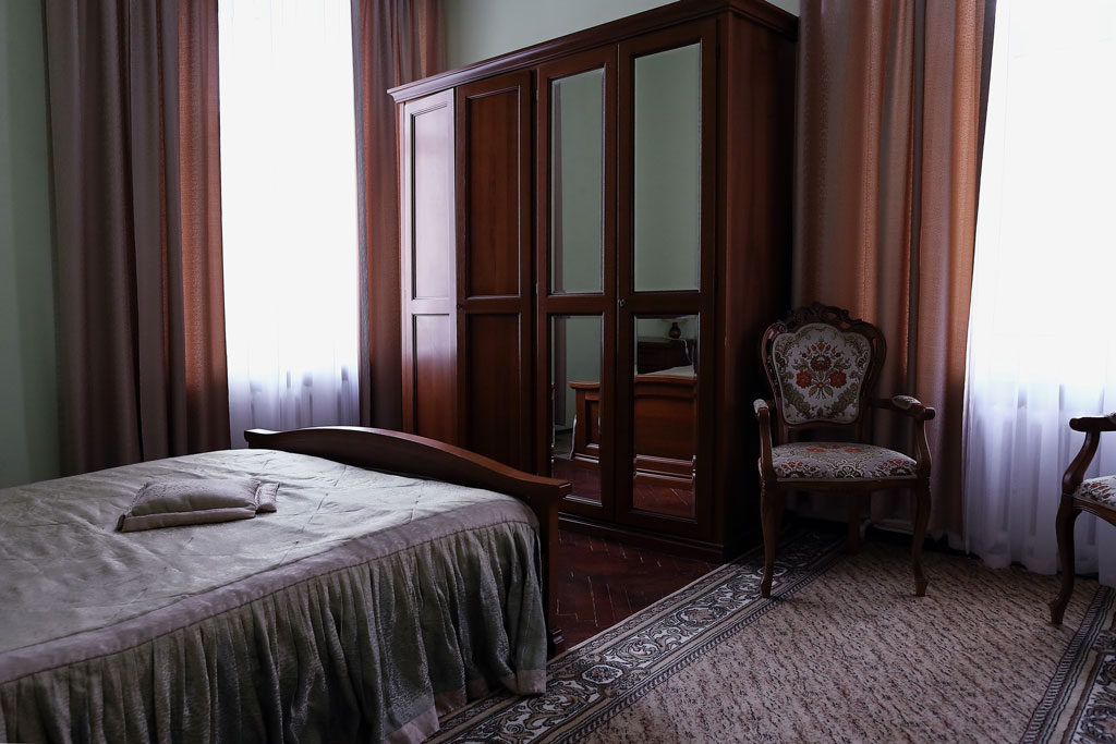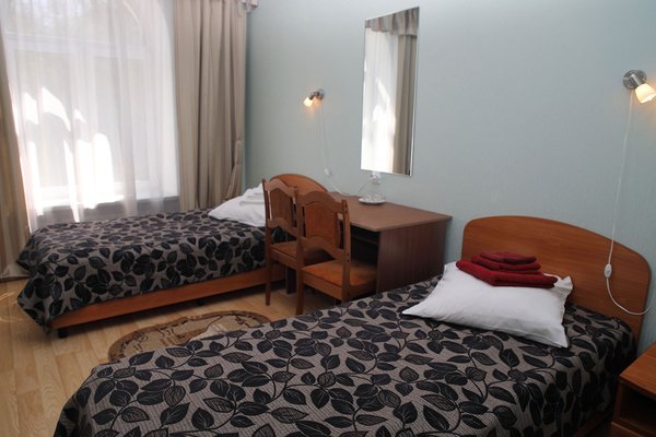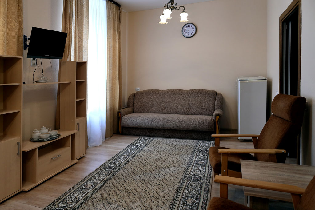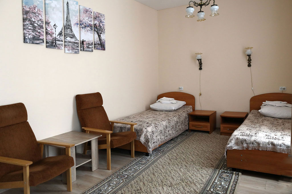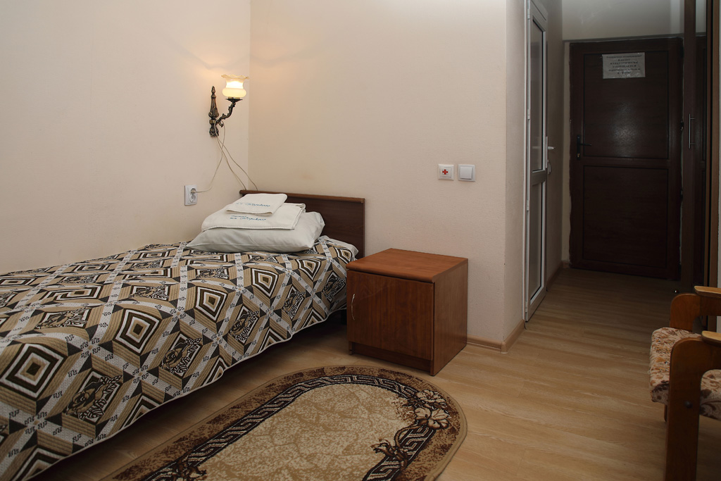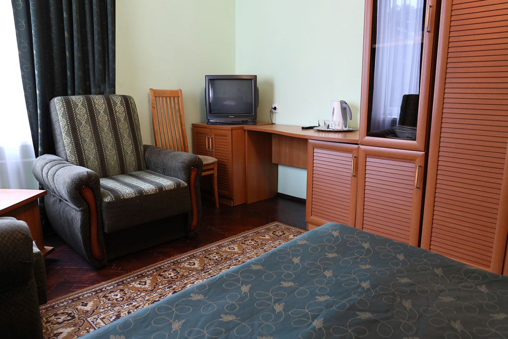 Номера здравницы оснащены современной мебелью, телевизором, холодильником и душем в ванной. В двухместных «Люксах» доступна ванная, а в гостиной двухкомнатного «Люкса» — обеденный стол с мягкими стульями, диван и кресла, а также столовый сервиз и выход на балкон. В спальной комнате предусмотрена двуспальная кровать, прикроватные тумбочки и шкаф.
