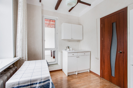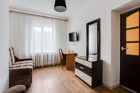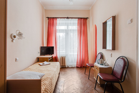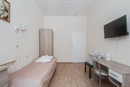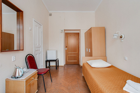 Мебель: Односпальная кровать, прикроватная тумбочка, шкаф, письменный стол, стул, вешалка для верхней одежды.