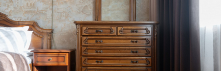 Мебель: зеркало, кровать двуспальная, прикроватные тумбочки, столик туалетный, шкаф встроенный.