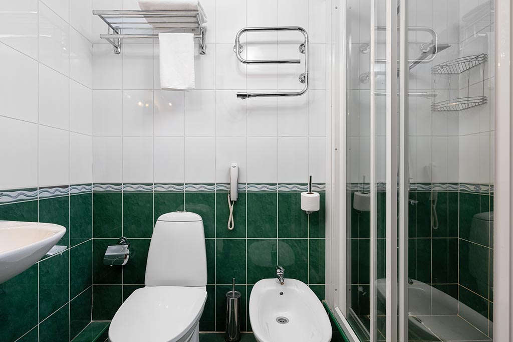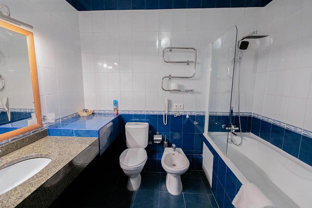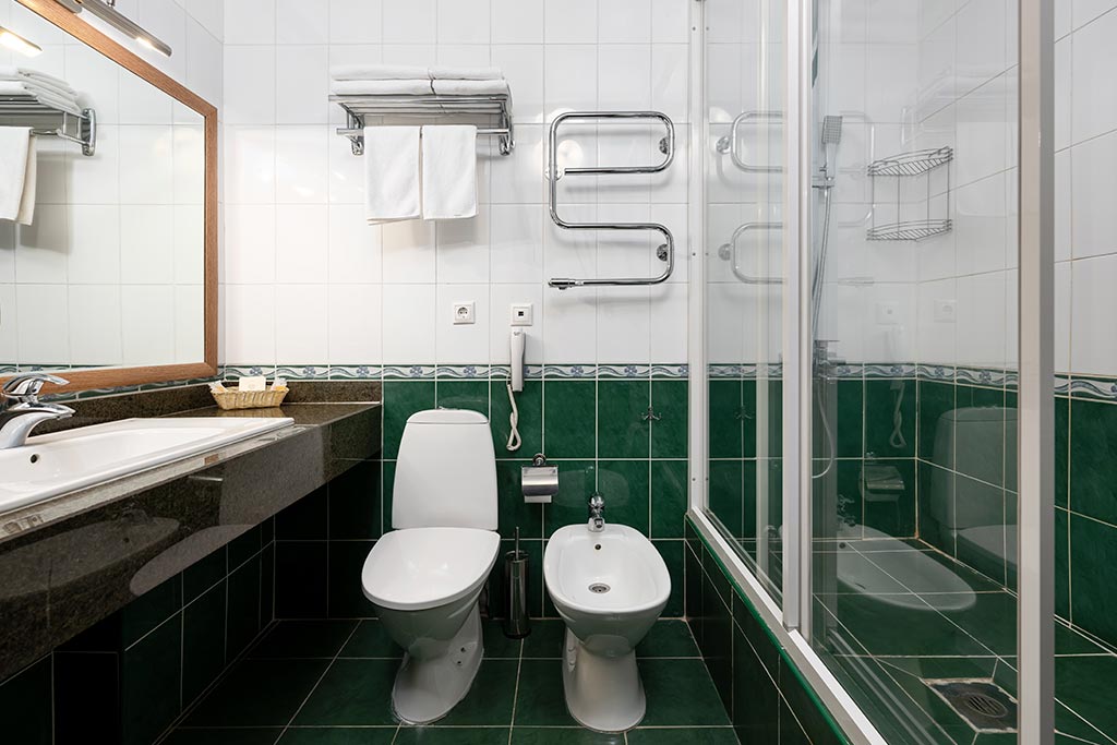Санузел: биде, с душем или ванной, тапочки, туалетные принадлежности, фен, халат.