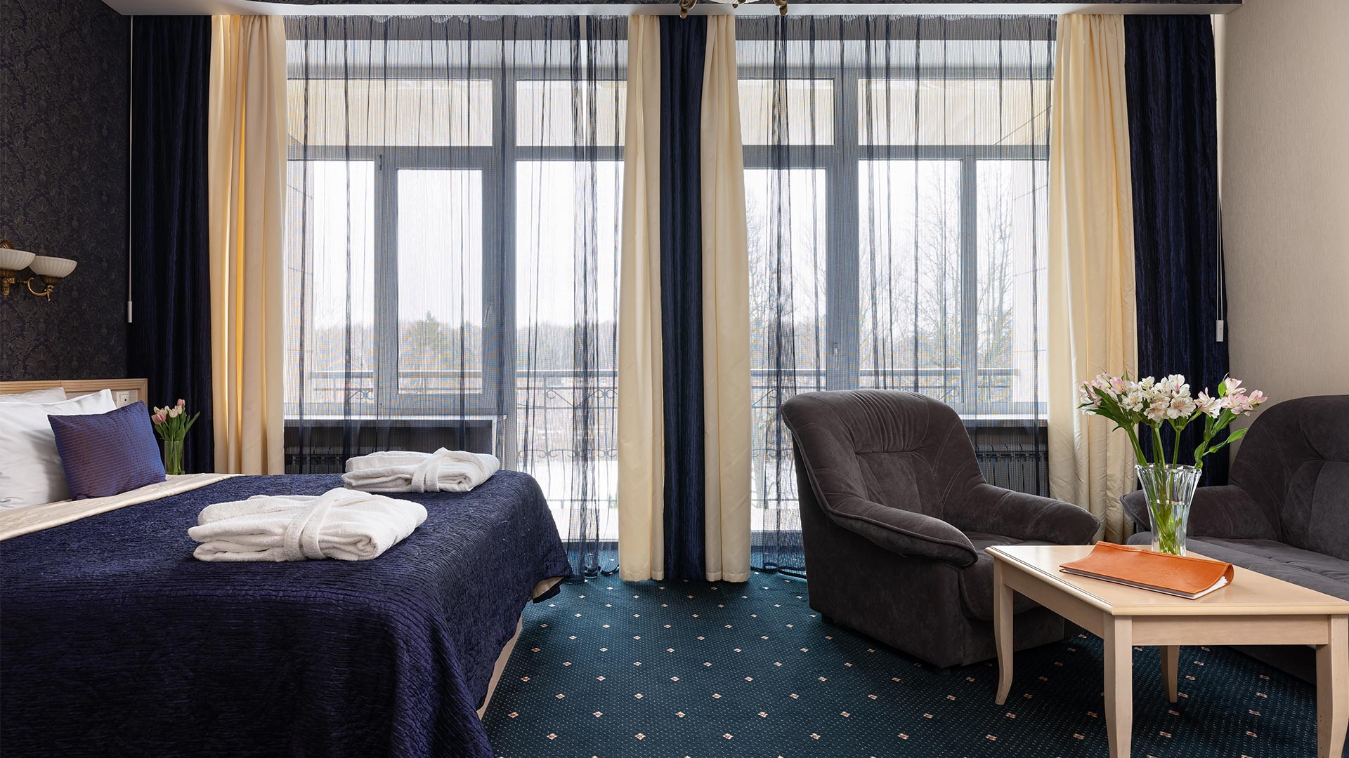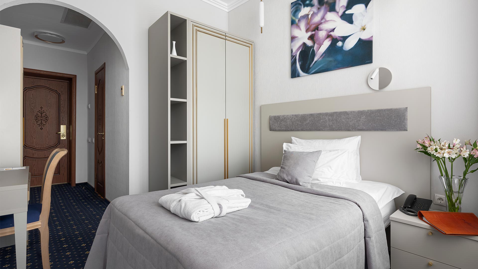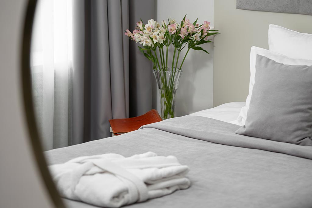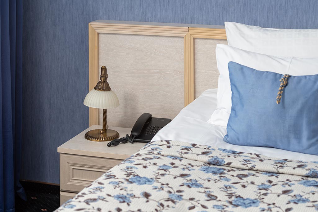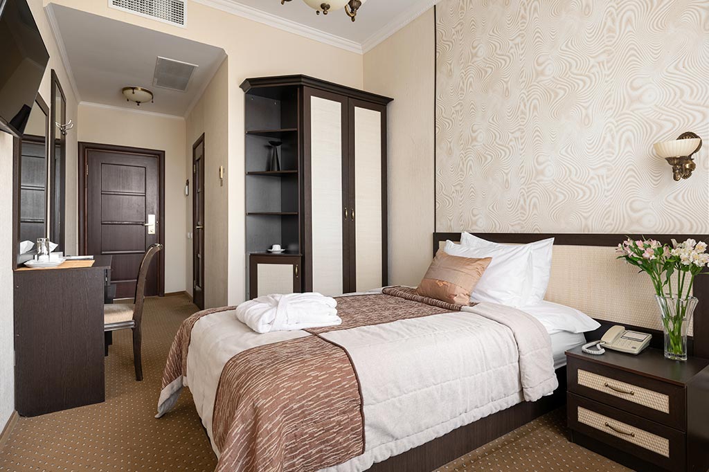 Сервис: смена полотенец, смена постельного белья, уборка номера, услуги телефонной связи по территории отеля.