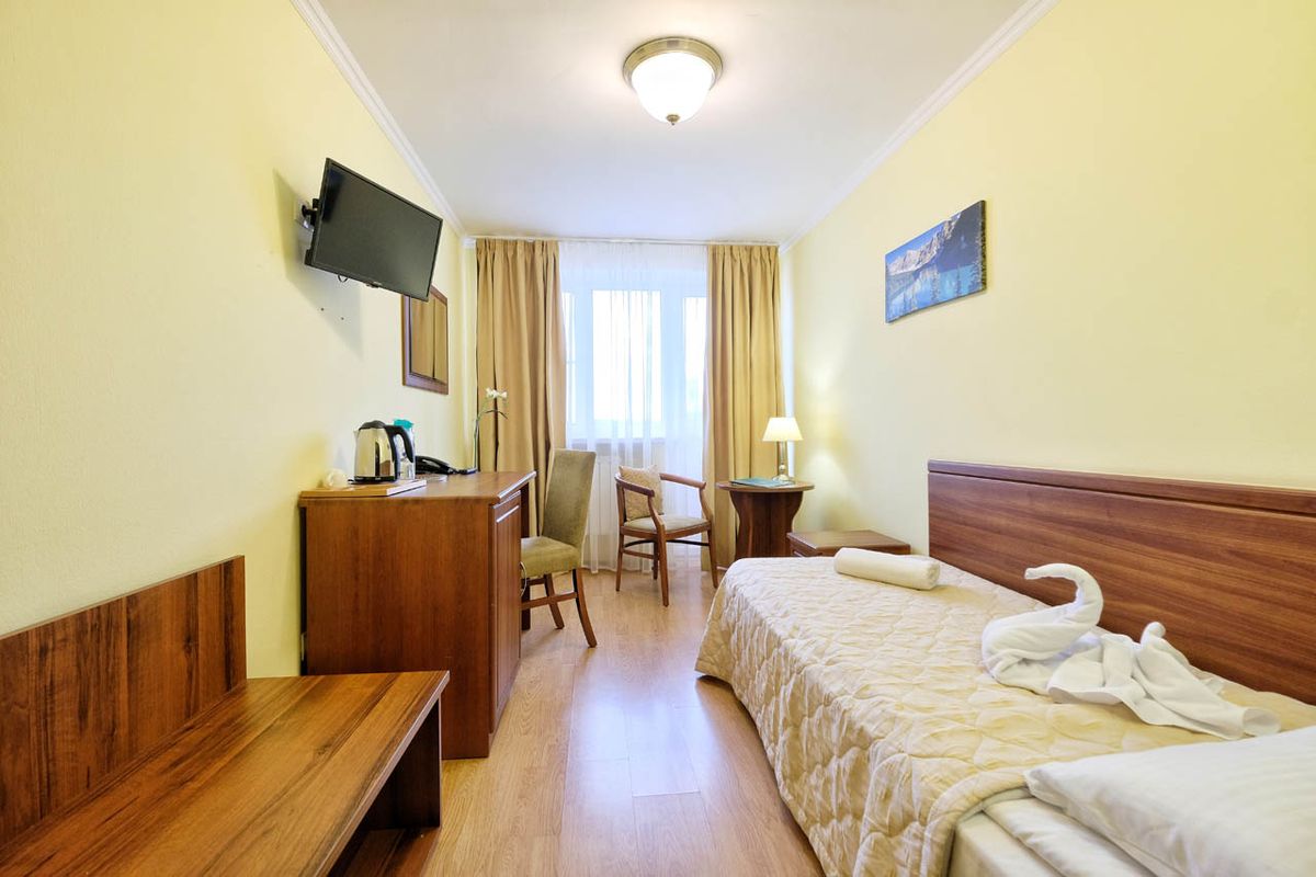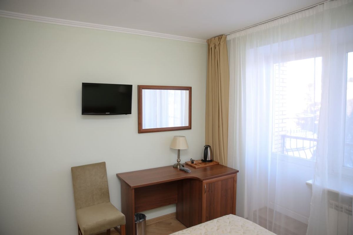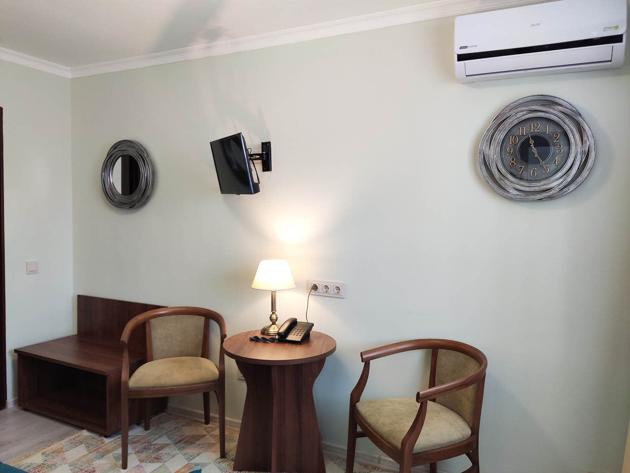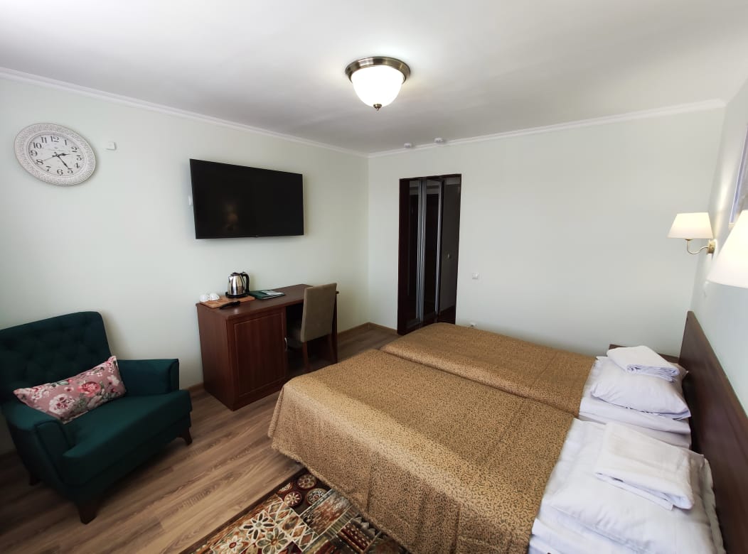 Оборудование: Телевизор, холодильник, телефон, электрочайник, сейф, доступ в интернет Wi-Fi, зеркало, комплект посуды (фужеры, рюмки, чайный сервиз, приборы).