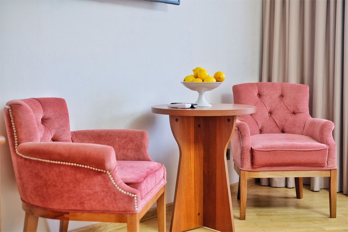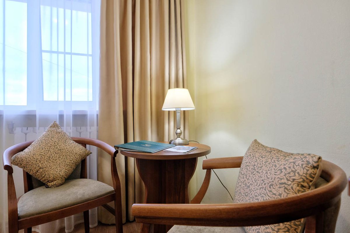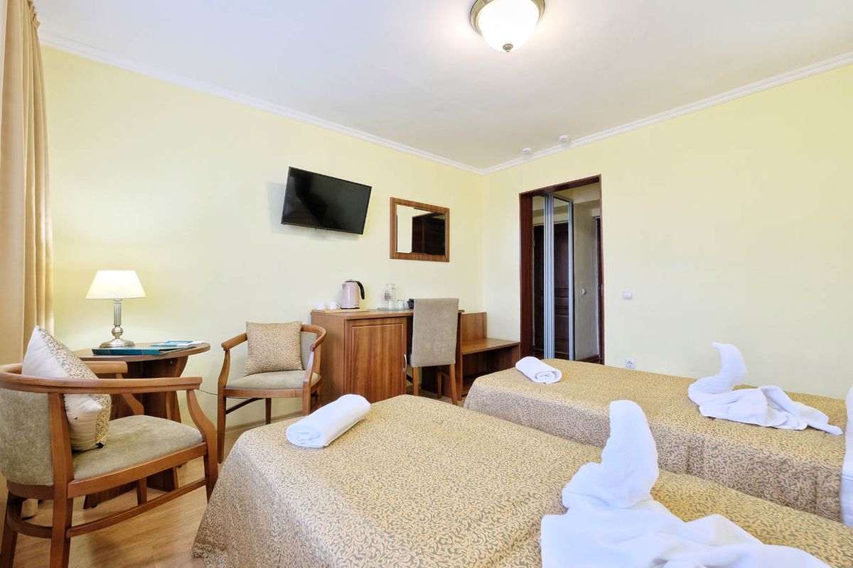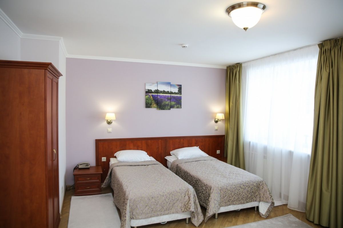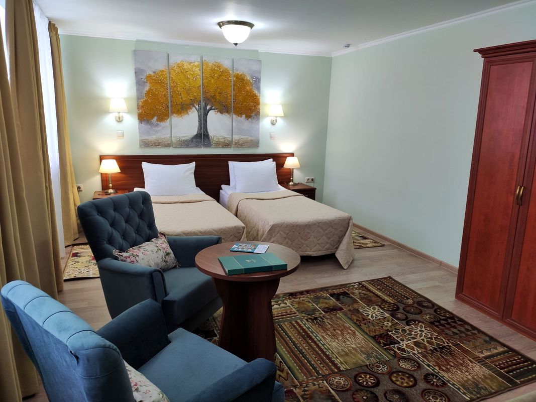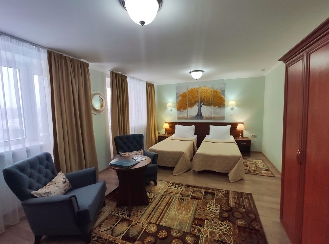 Мебель: Две раздельные кровати (возможно соединение), две тумбочки, журнальный столик, два кресла, шкаф-купе, два стула.