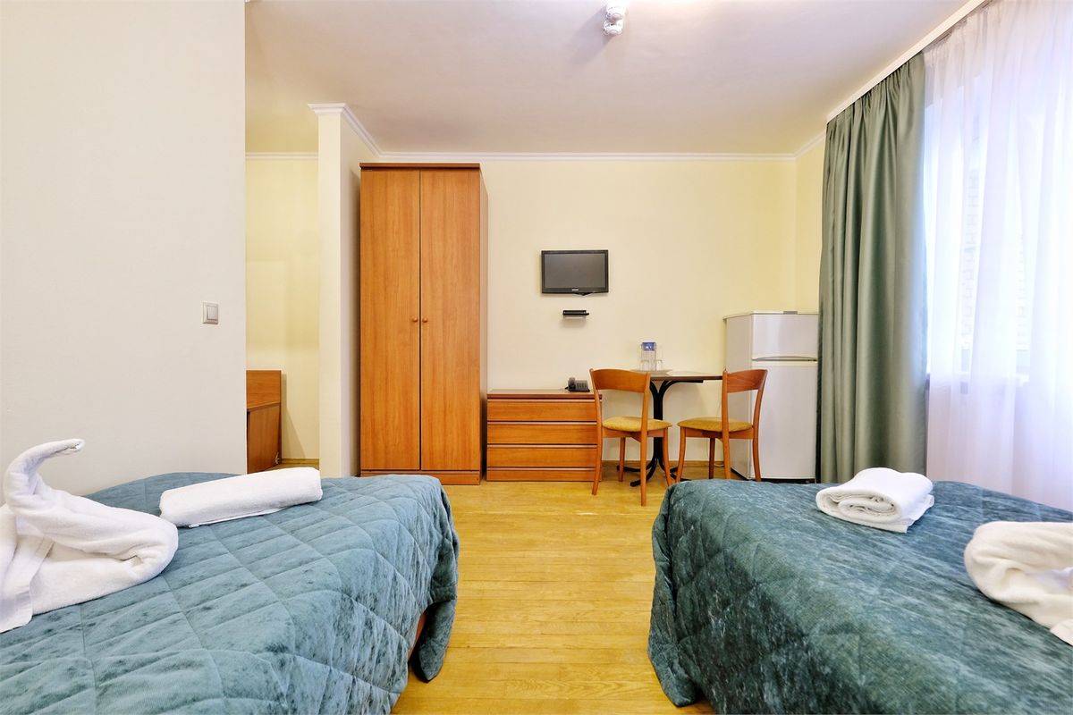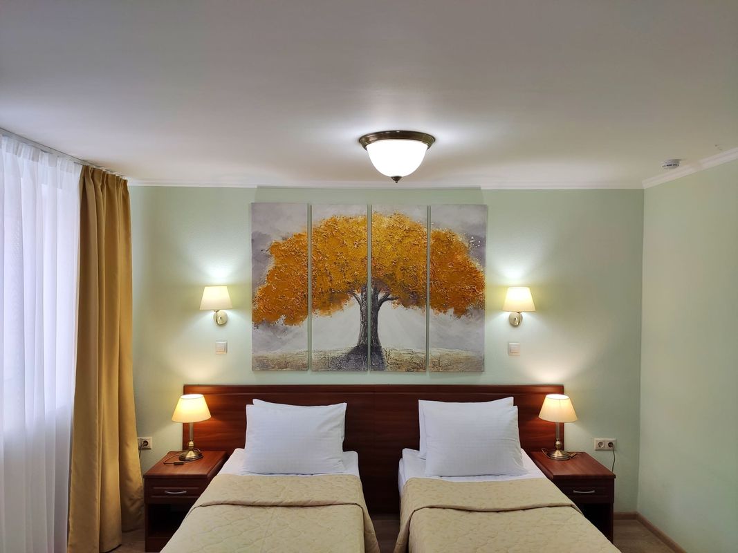 Мебель: Две односпальные кровати (возможно соединение), две прикроватные тумбы, письменный стол, два стула, шкаф-купе.
