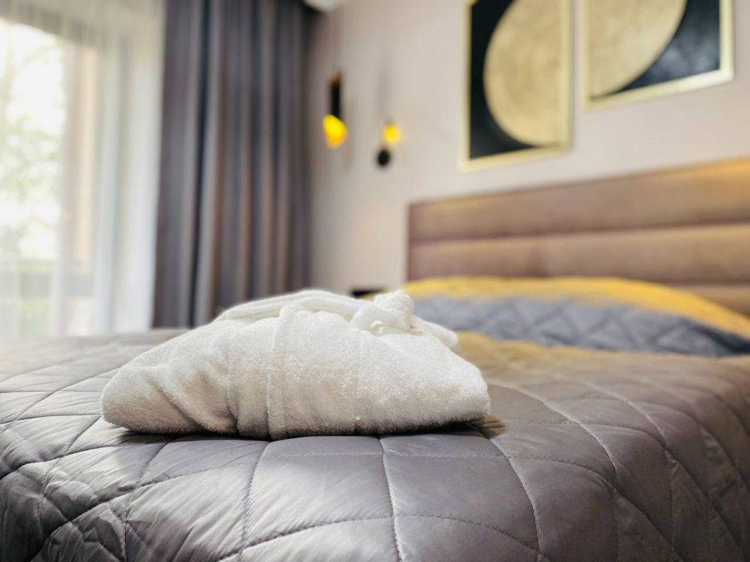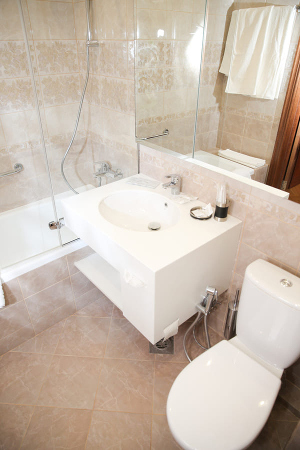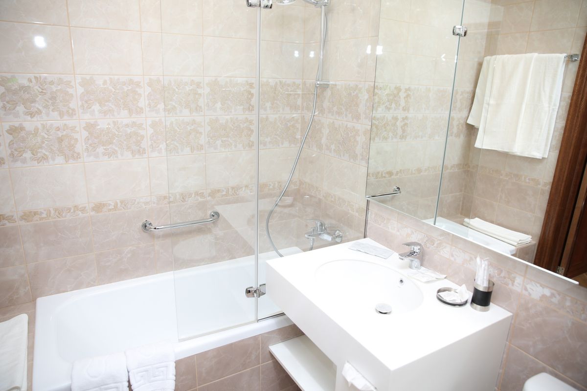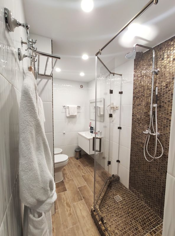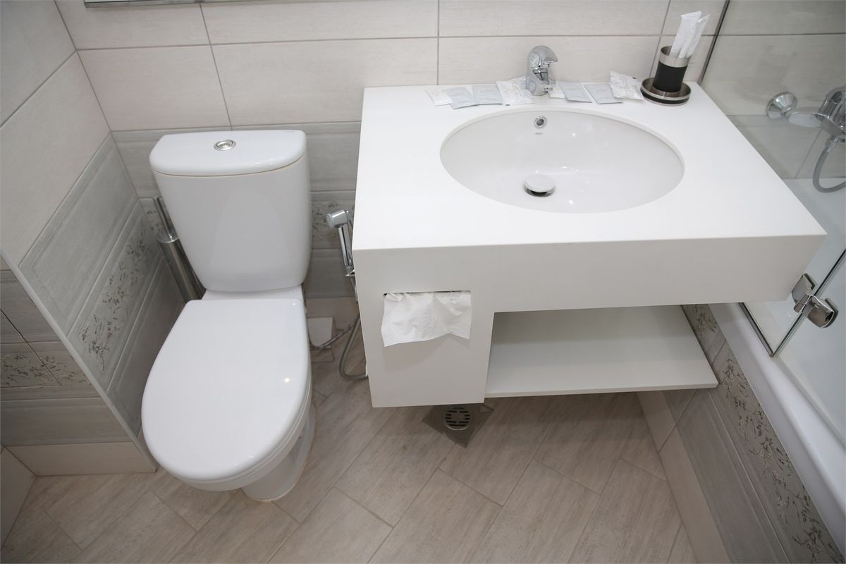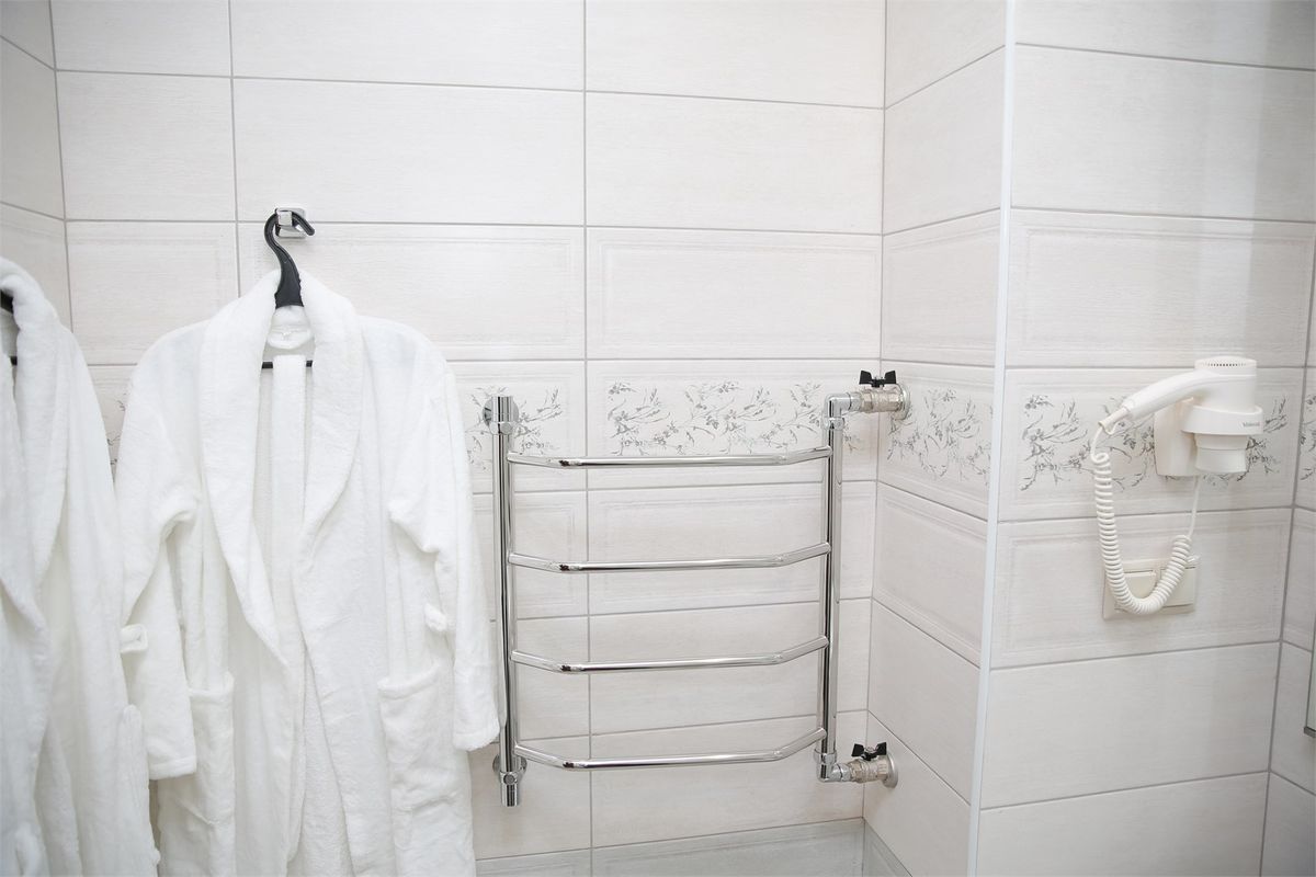 Санузел: Совмещенный санузел с душем, умывальником и унитазом. Предоставляется комплект полотенец (3 вида), средства гигиены в дозаторах, индивидуальные туалетные принадлежности, халаты, одноразовые тапочки.