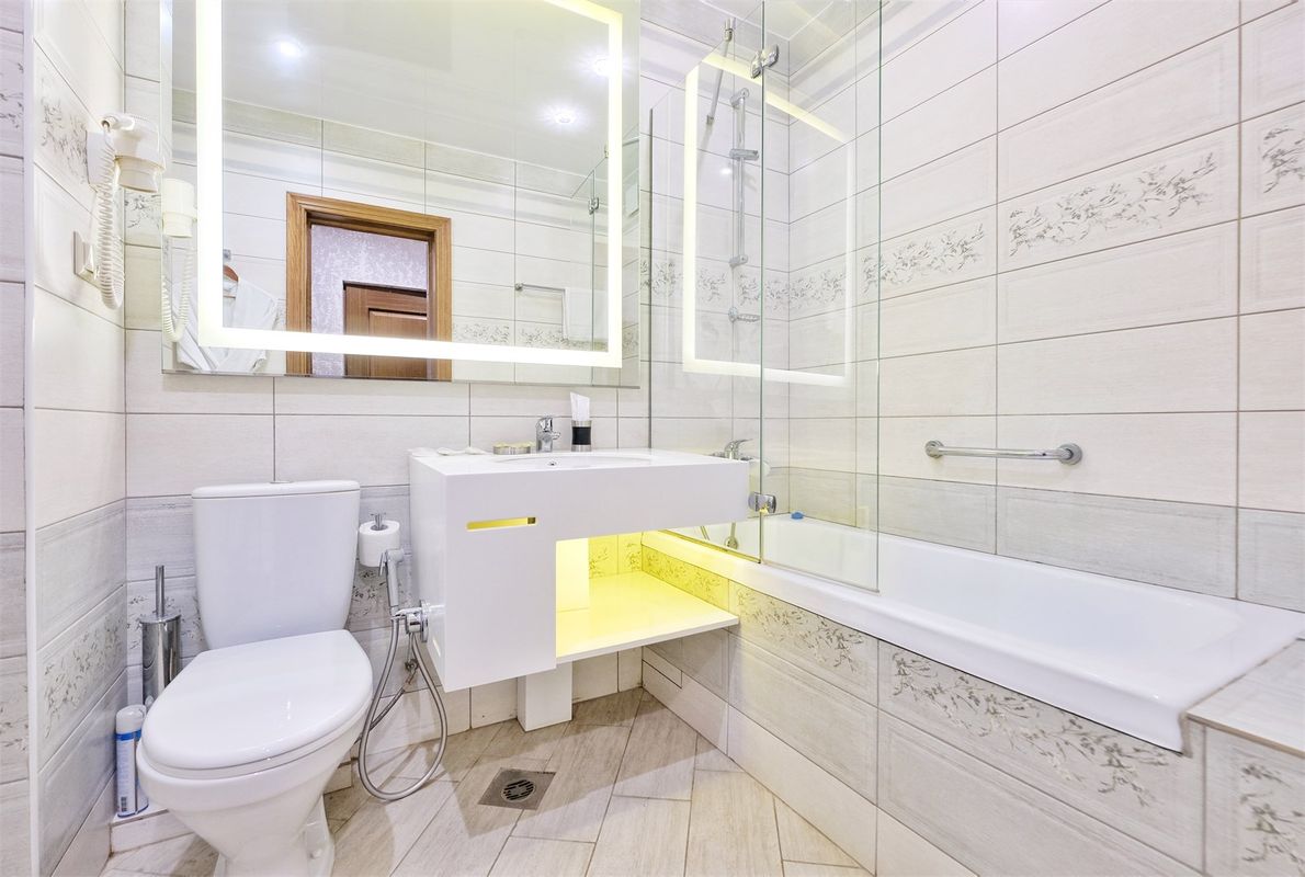 Санузел: Совмещенный санузел с ванной, умывальником и унитазом. Предоставляется комплект полотенец (3 вида), средства гигиены в дозаторах, индивидуальные туалетные принадлежности, фен, халаты, одноразовые тапочки.