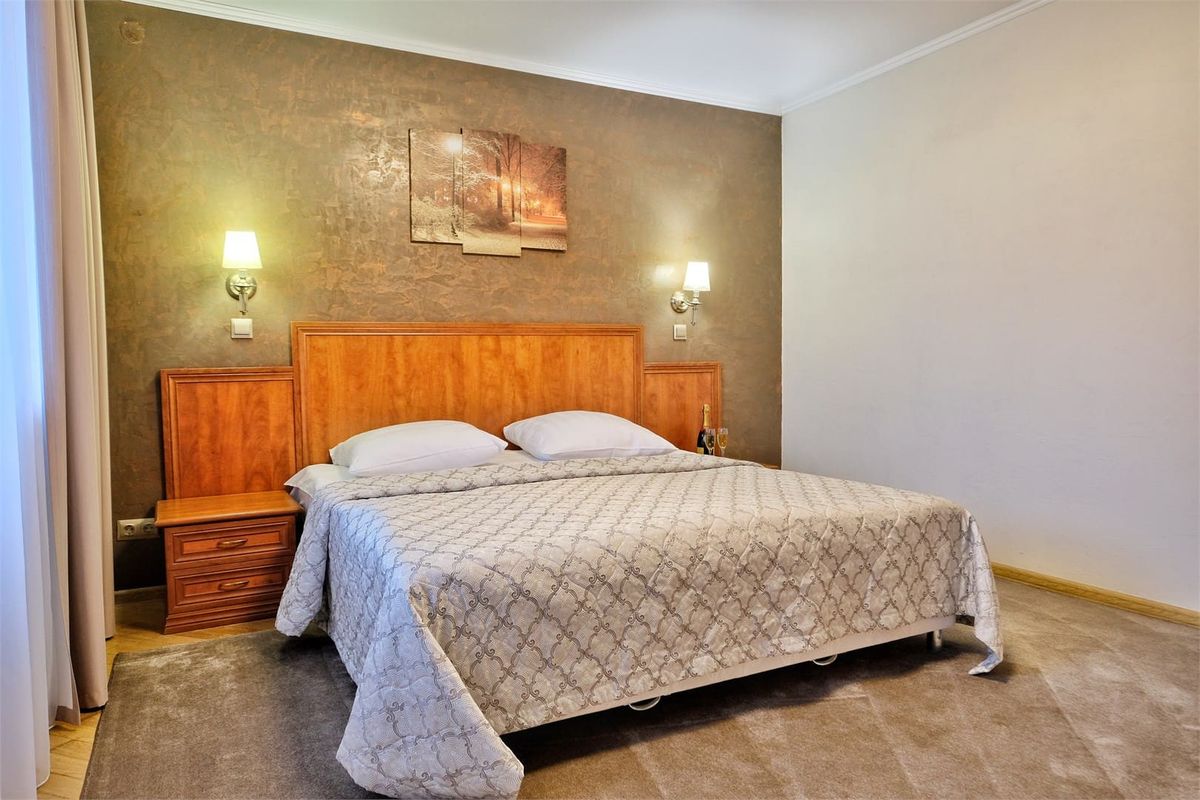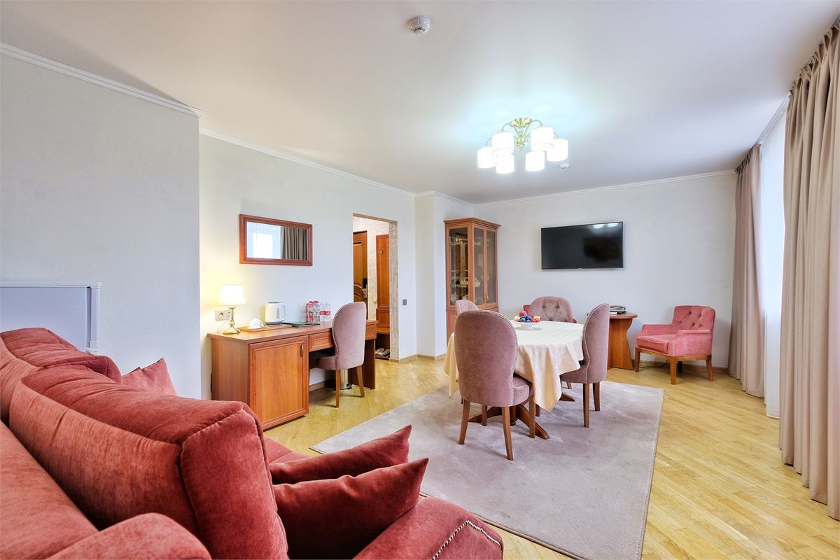 Мебель: Две раздельные кровати (возможно соединение), две тумбочки, журнальный столик, два кресла, шкаф-купе, раскладной диван, письменный стол, стул.