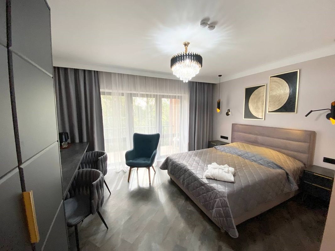 Мебель: Двухспальная кровать, две прикроватные тумбы, диван, кресла, журнальный столик, обеденный стол, стулья, письменный стол, шкаф для одежды, сервант.