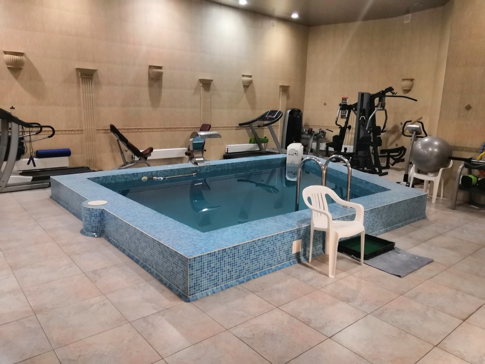 • Банный комплекс: сауна, мини-бассейн 4×5 м, душ-водопад, гидромассаж, ЛФК в воде