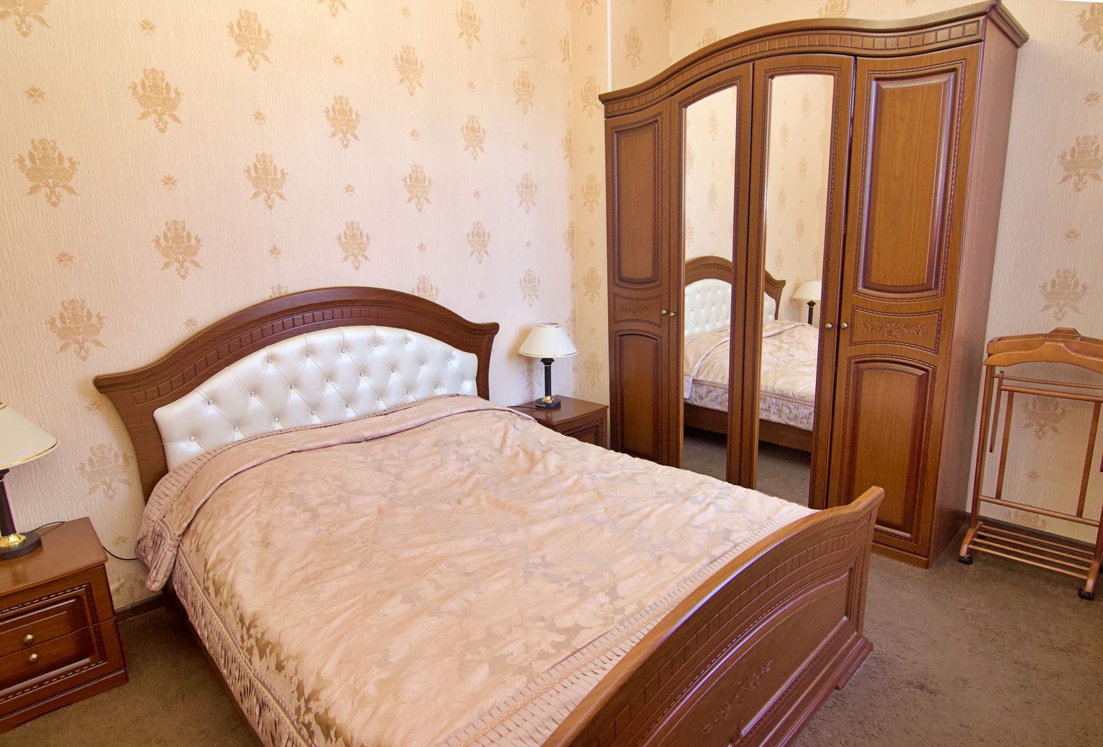 Мебель: вешалка, зеркало, кровати односпальные, прикроватные тумбочки, стол, стулья, шкаф.