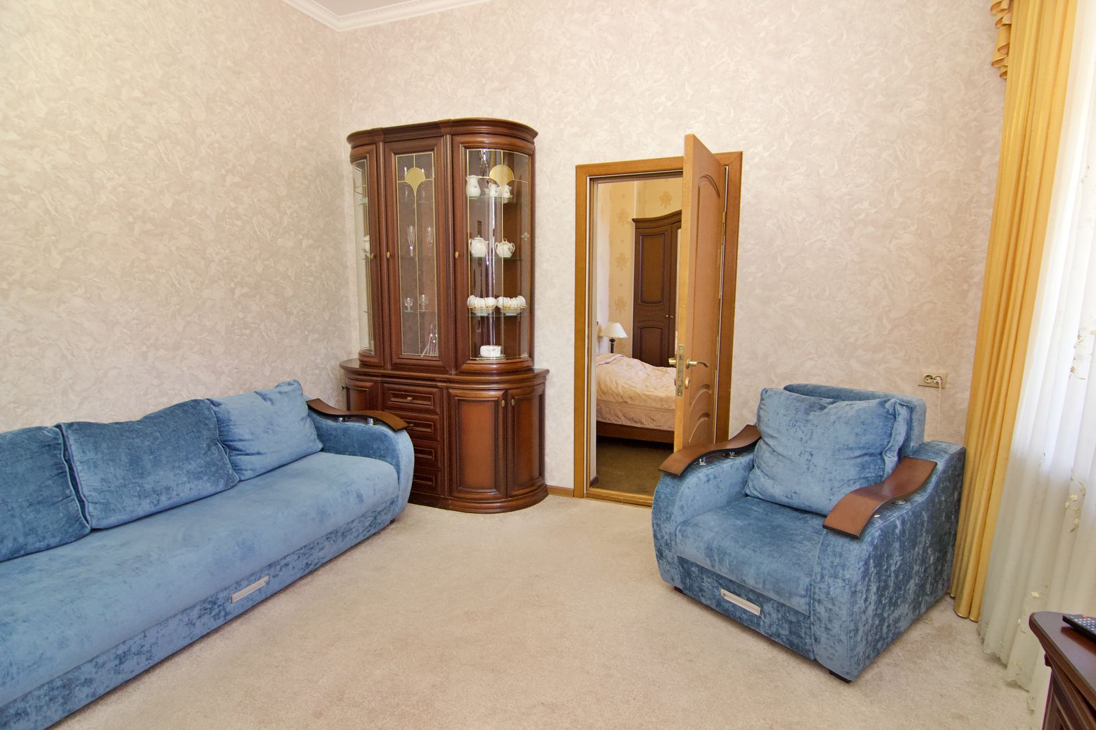 Мебель: вешалка, зеркало, кресло-кровать, кровать двуспальная, прикроватные тумбочки, стол, стулья, шкаф.