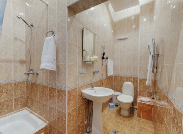 Санузел: с ванной или душевой кабиной, туалетные принадлежности, фен.