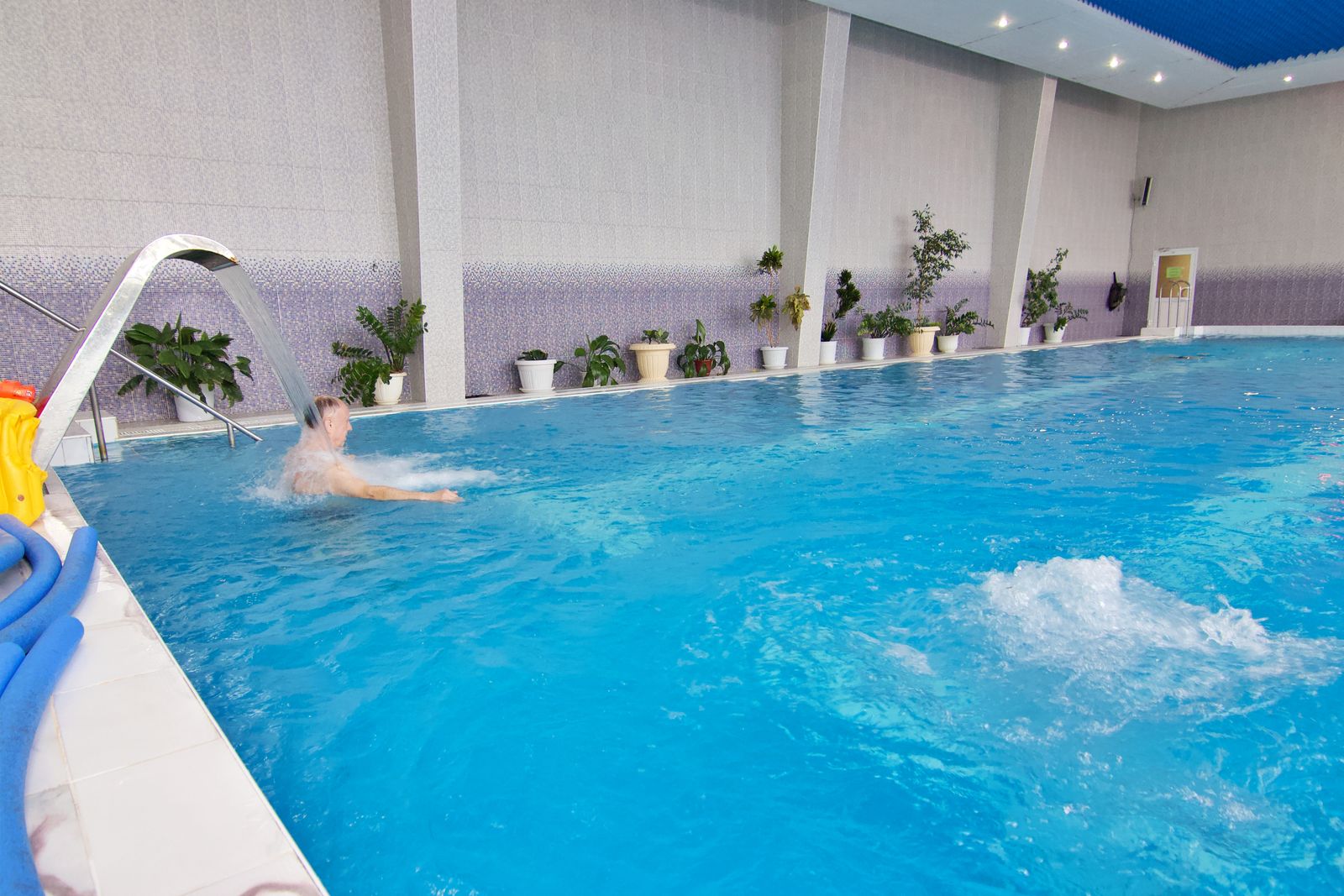 Бассейн: крытый бассейн 20×8 м с водопадом, включен в стоимость путевки. Проводятся занятия ЛФК и аквааэробикой