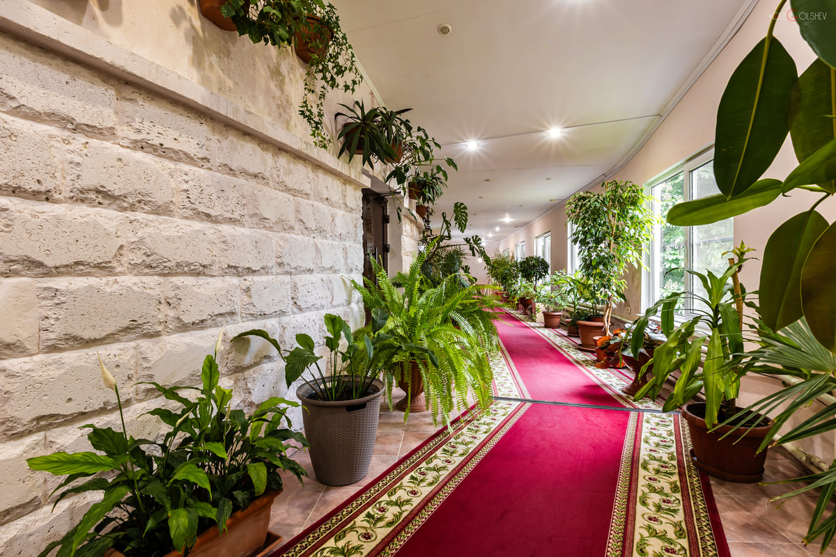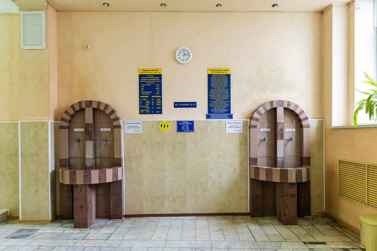 • Собственный питьевой бювет: на территории санатория подаётся минеральная вода из Источника №29 и в шаговой доступности городские источники №1, 4, 7.