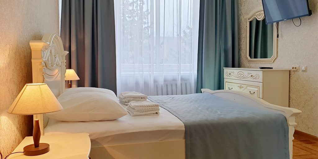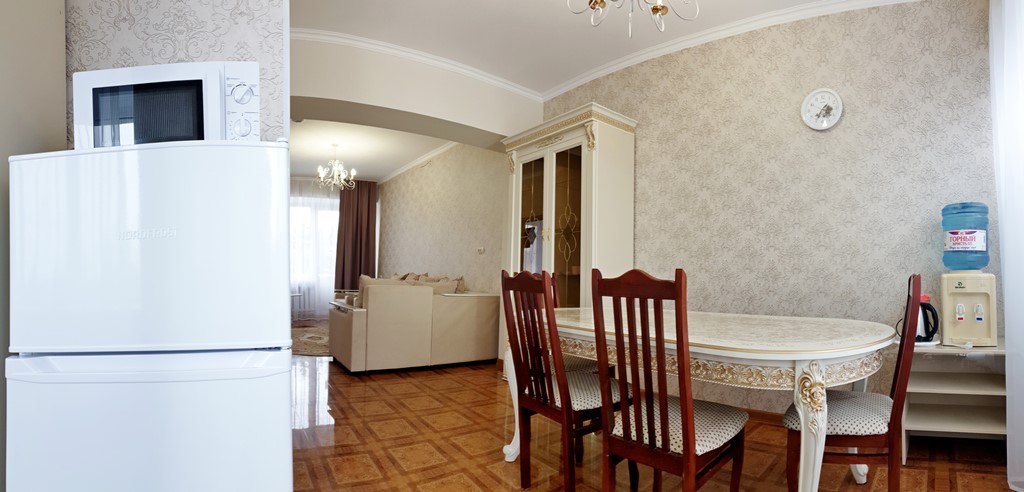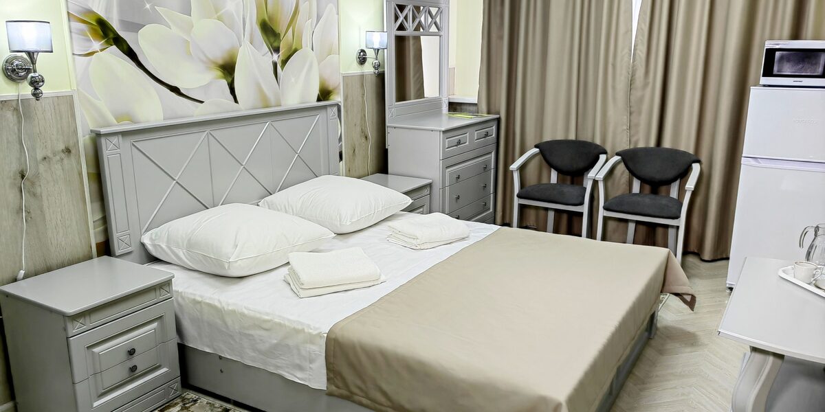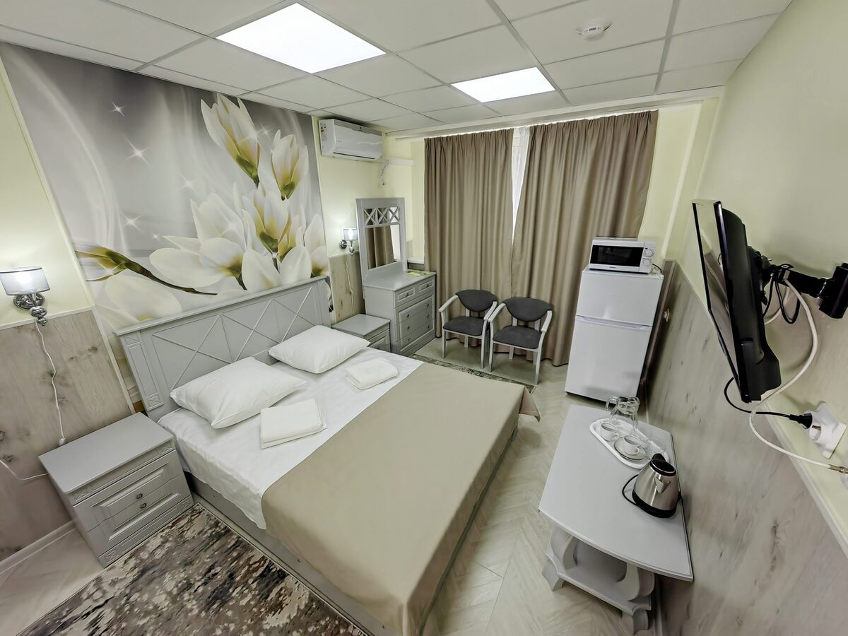 Оборудование: Телевизор, холодильник, кондиционер, электрочайник, набор чайной посуды, фен, махровый халат.