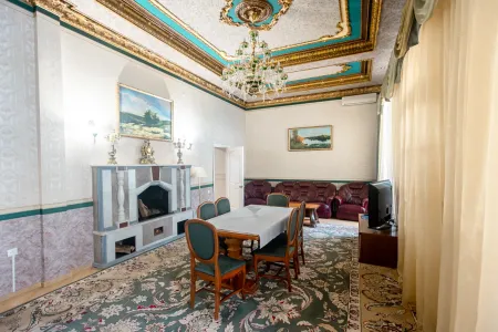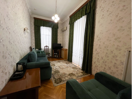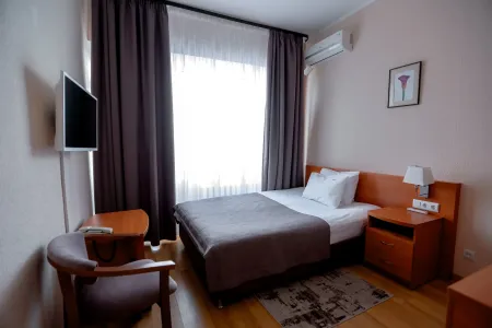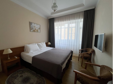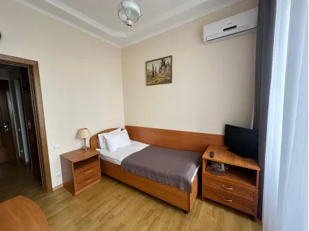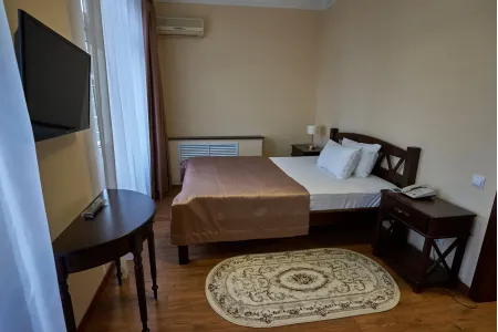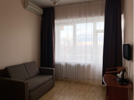 Номера: с видом на лес или панораму Пятигорска, в ясную погоду виден Эльбрус. Есть варианты с балконом и кондиционером