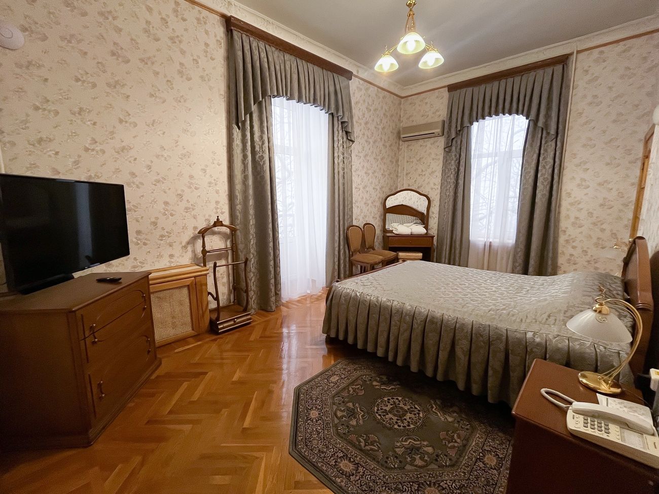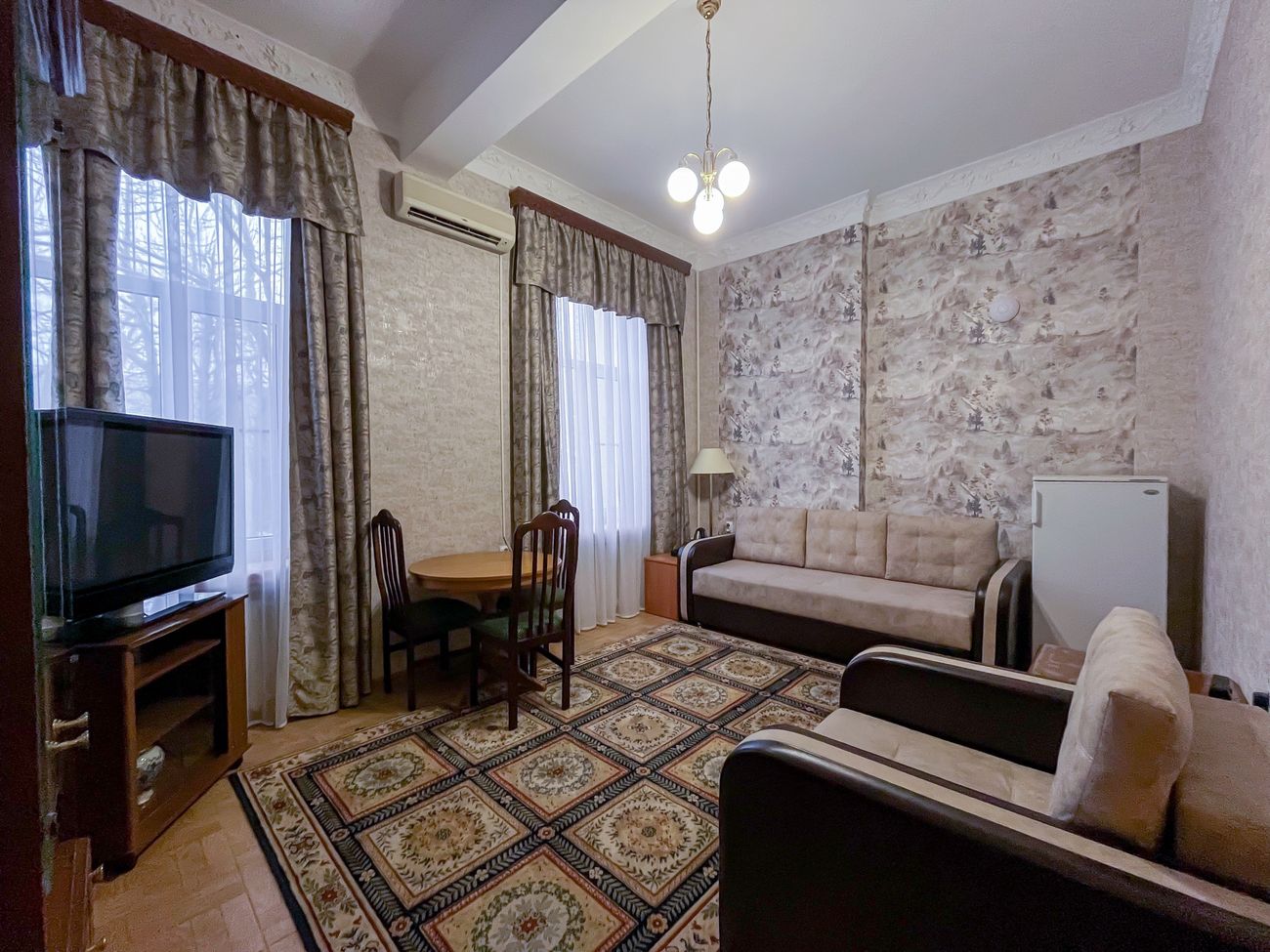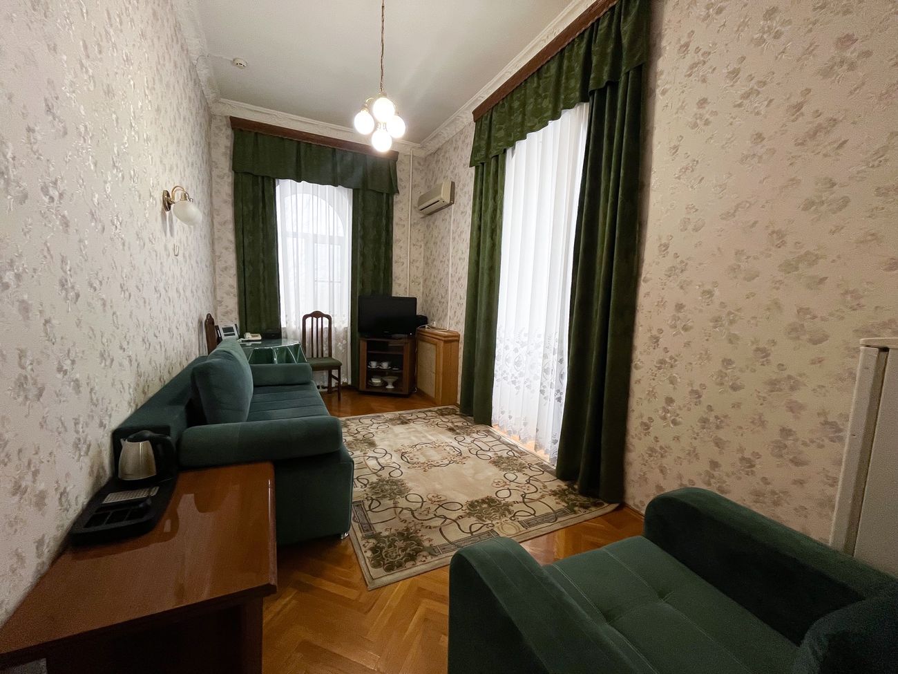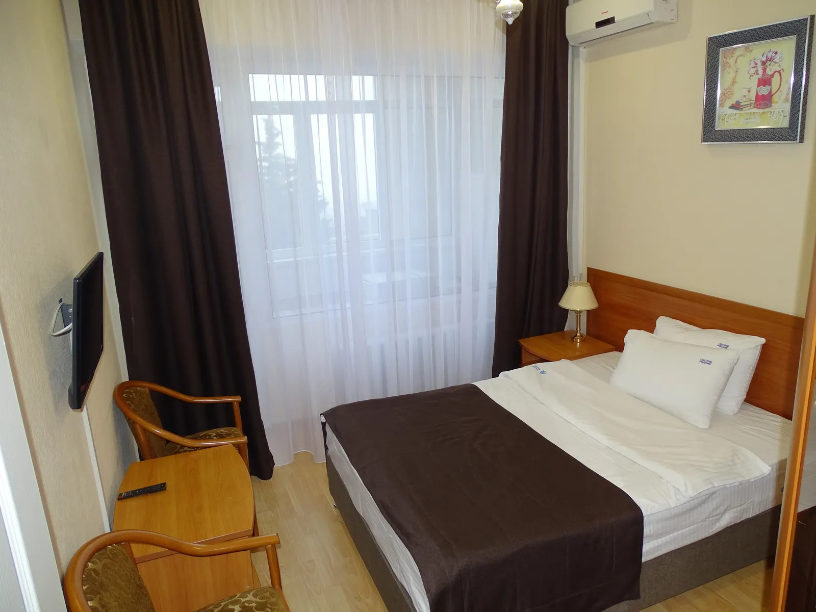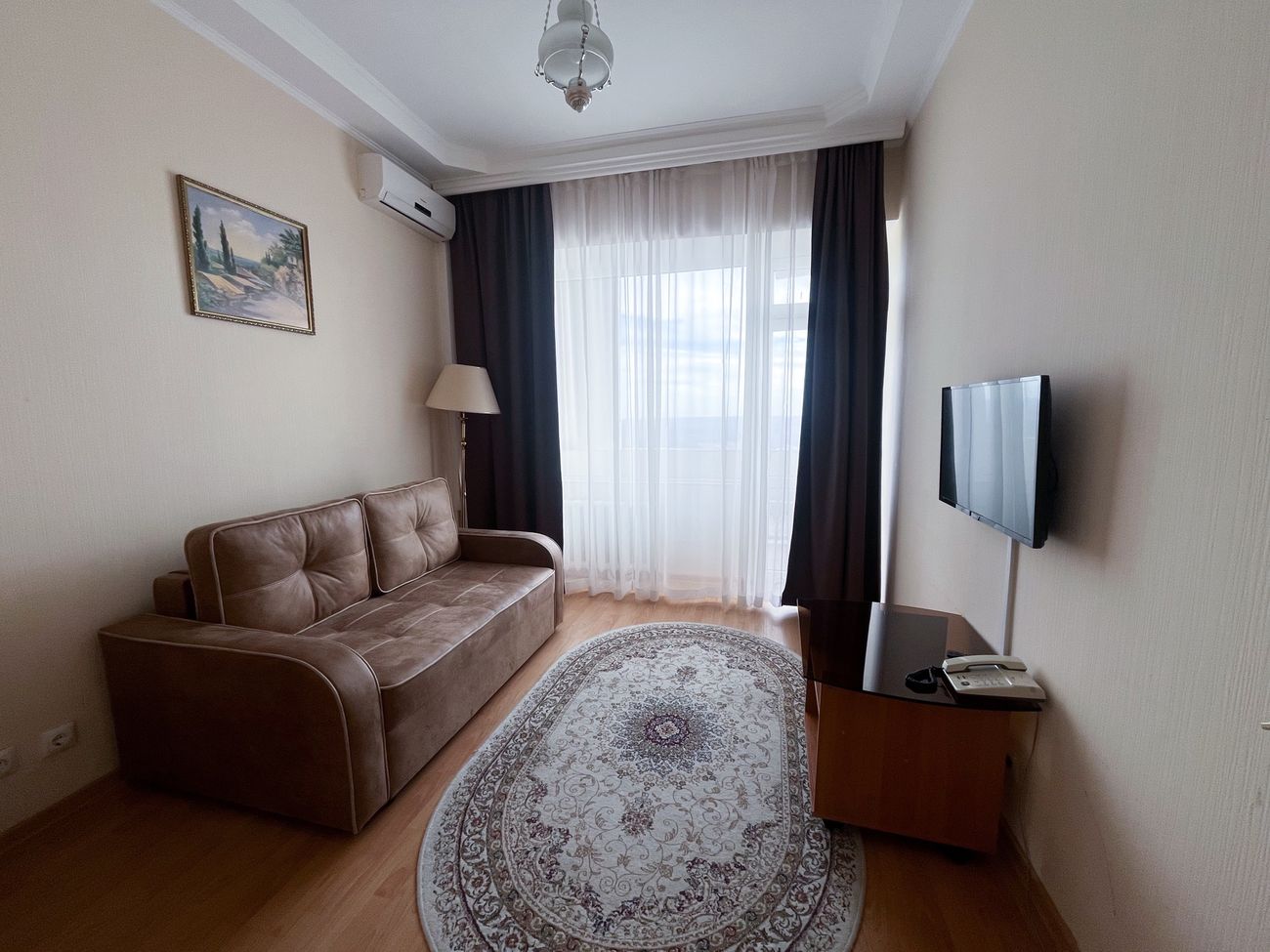 Оборудование: Телевизор, мини-холодильник, электрочайник, комплект посуды, телефон, сейф, Wi-Fi, фен, кондиционер.