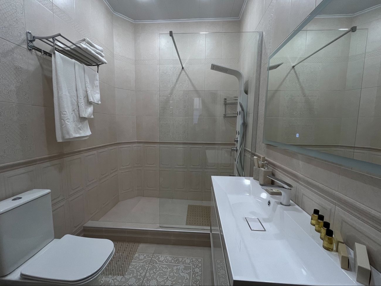 Санузел: Душевая кабина или ванная, косметические принадлежности, комплект полотенец.