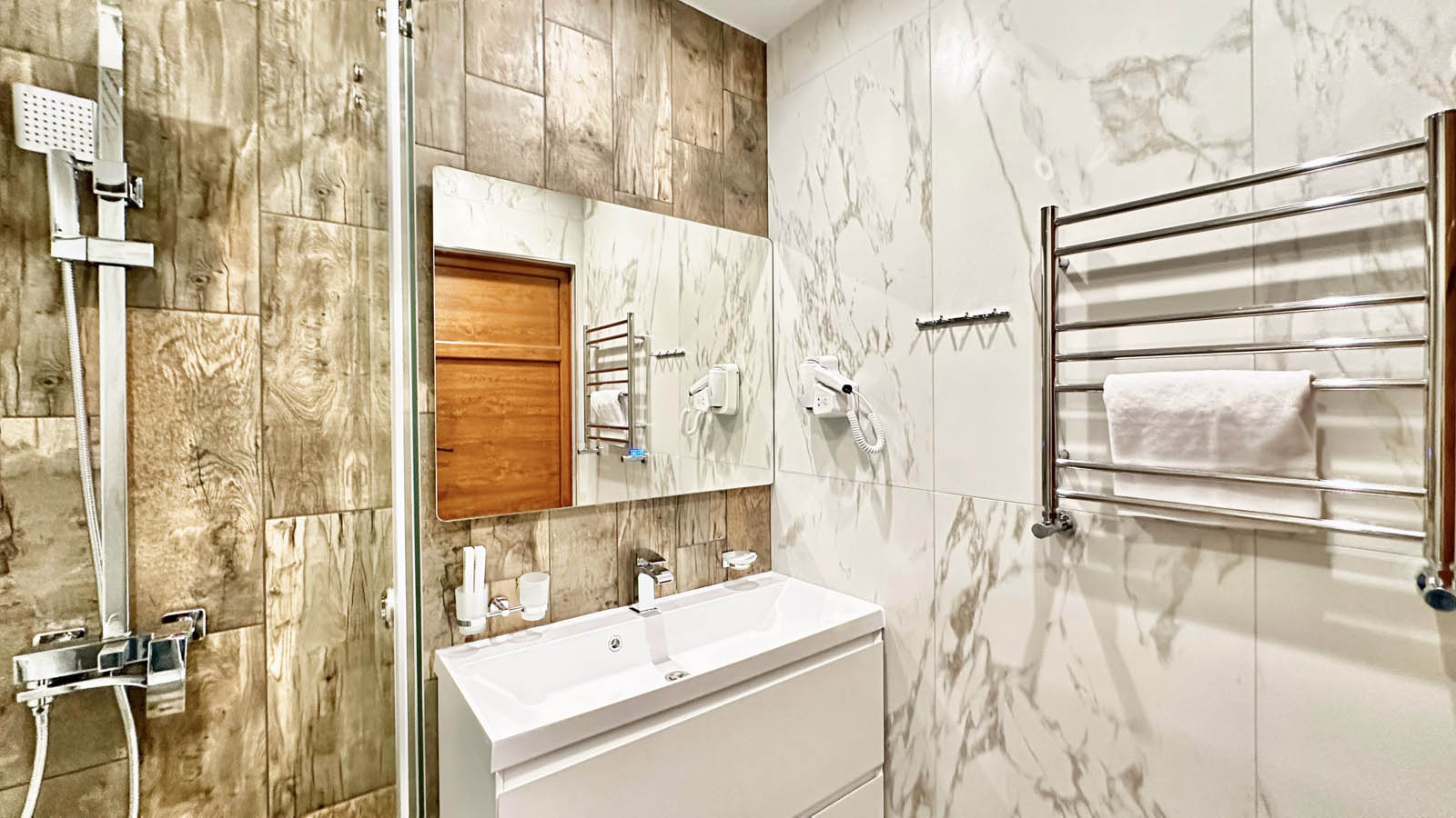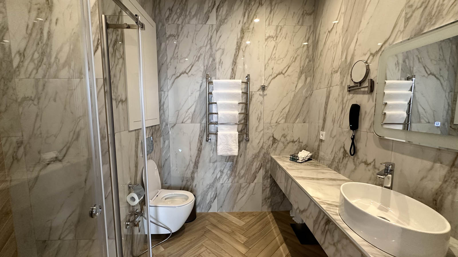 Санузел: с душем или ванной, тапочки, туалетные принадлежности, фен, халат.