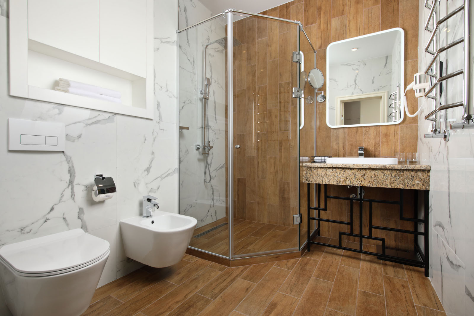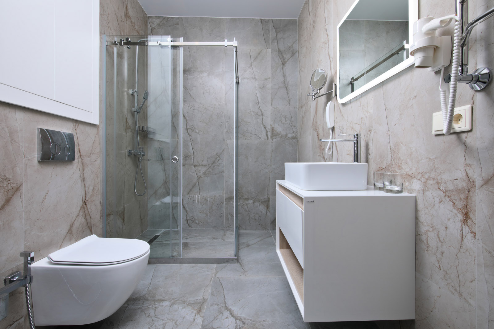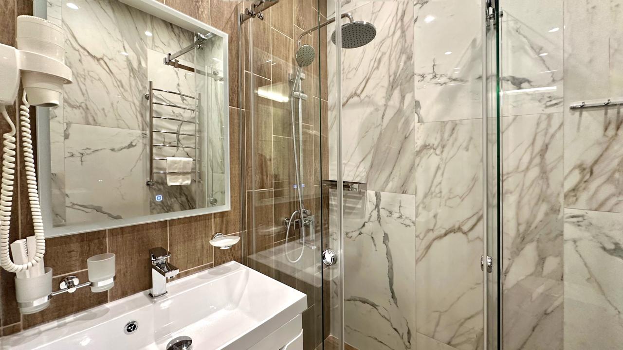 Санузел: Душевая кабина, душ, биде, унитаз, раковина, косметические средства.