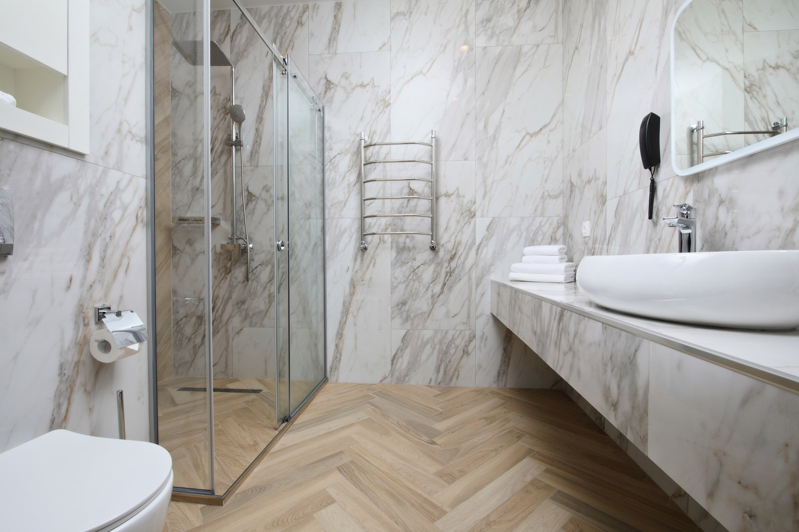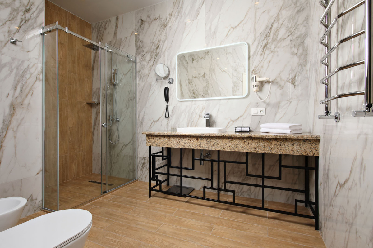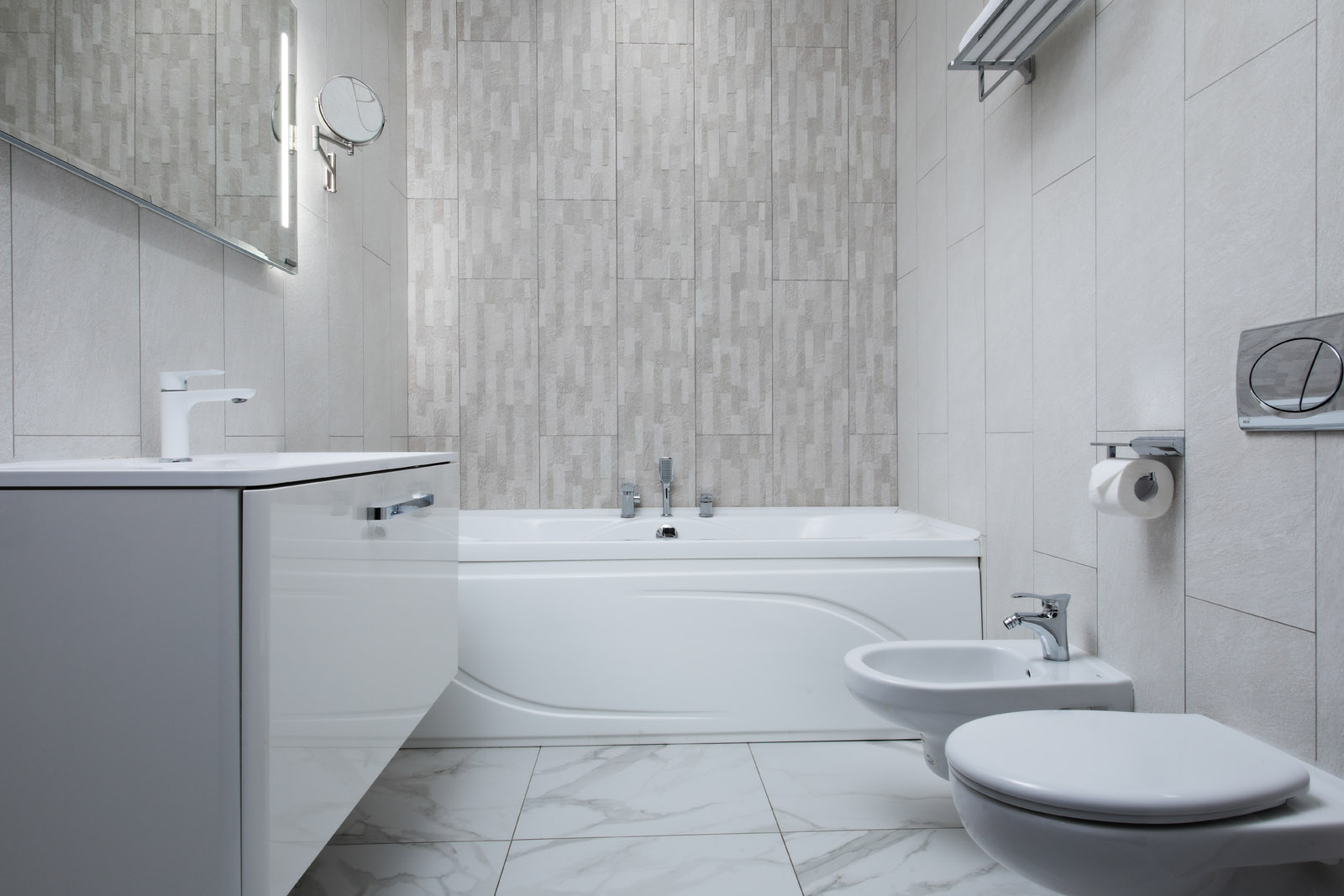Санузел: Душевая кабина, душ, биде, унитаз, раковина, косметические средства.