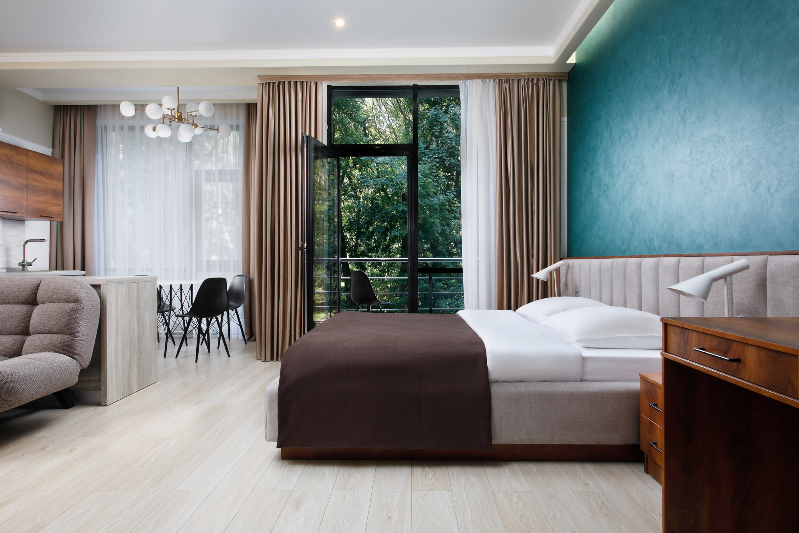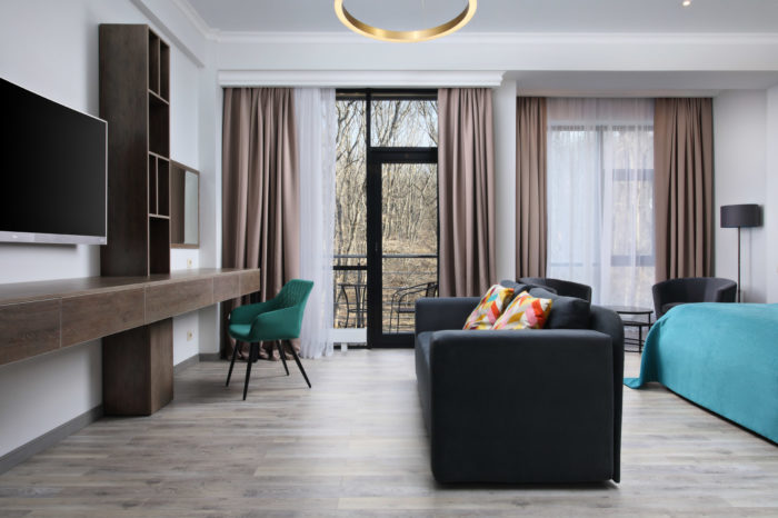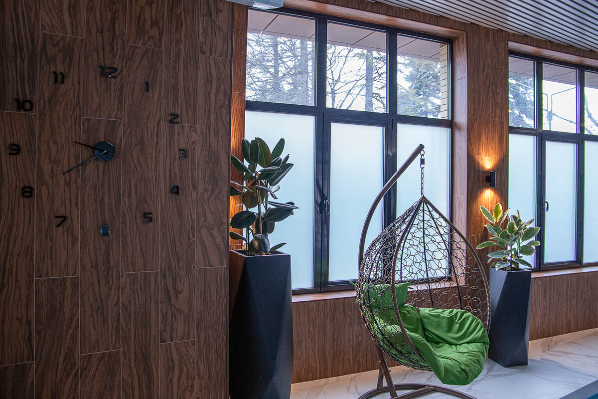 Номера с видом: с панорамными окнами на горы и лес, есть варианты с балконами для ужинов с видом на закат