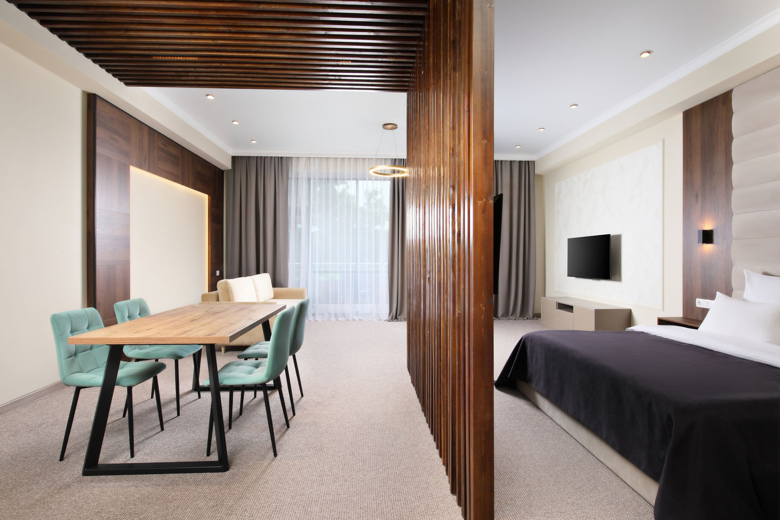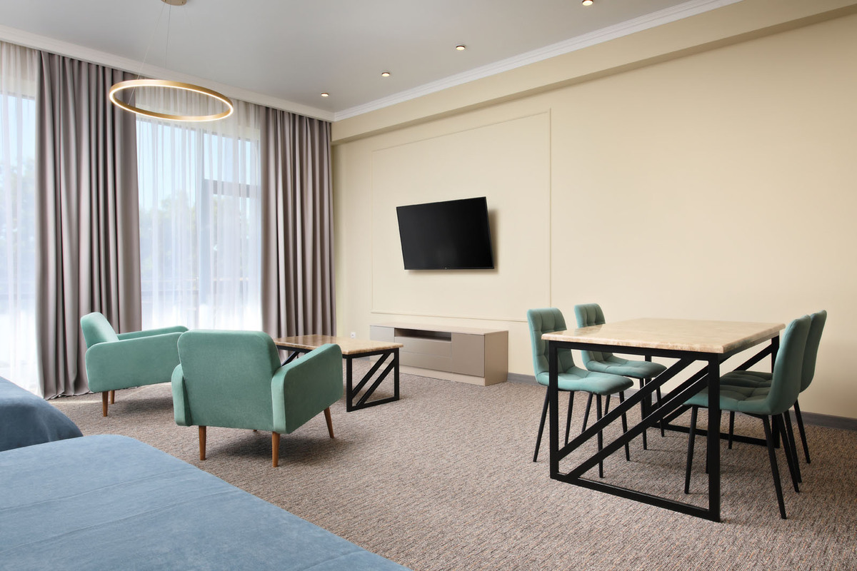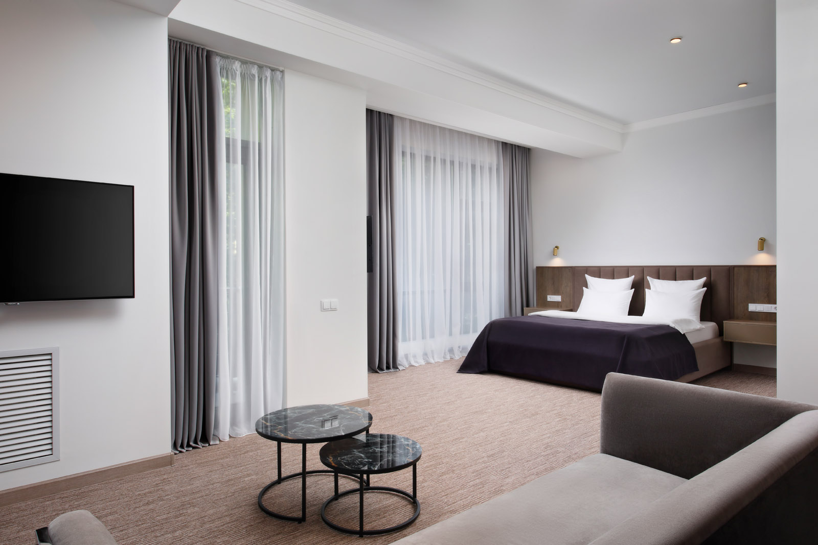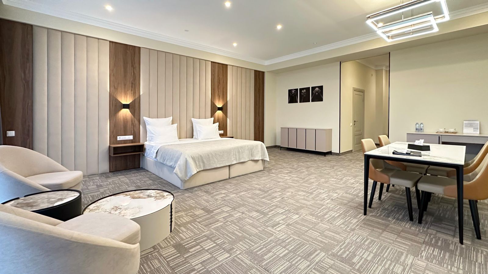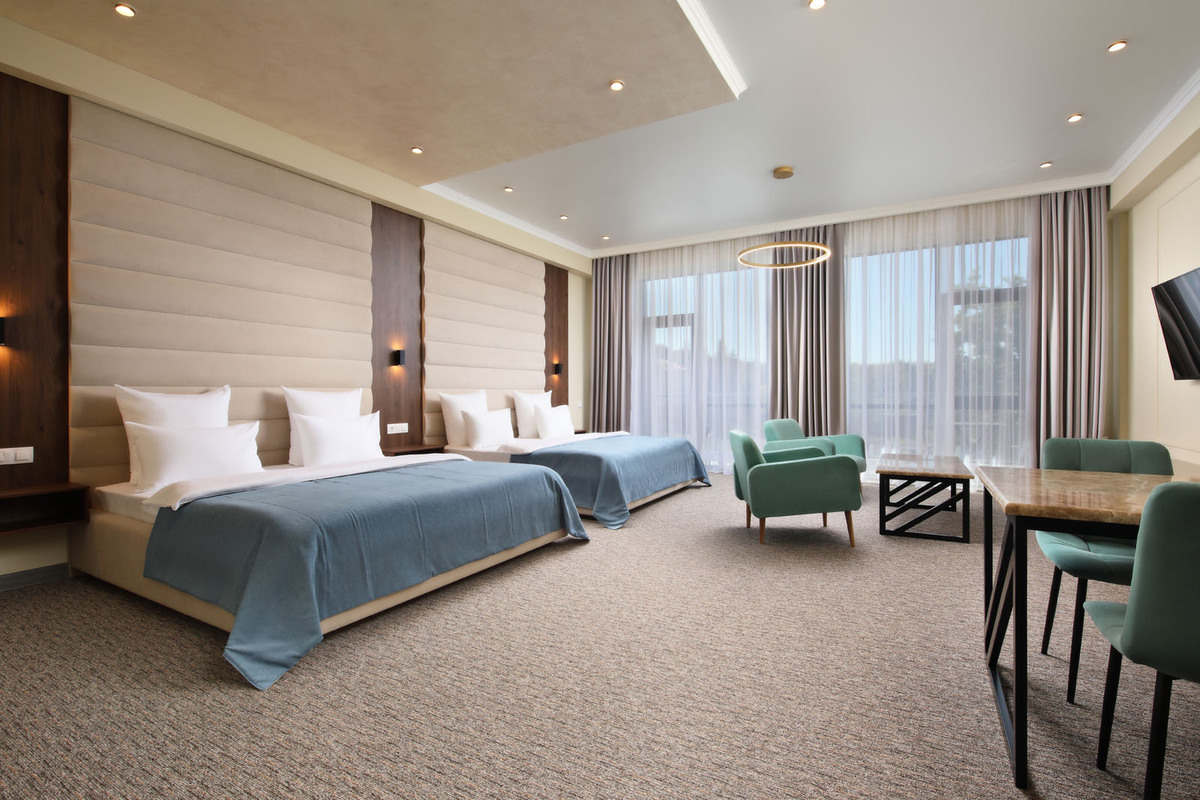 Здравница новая и предлагает просторные номера различных категорий: от «Стандартов» до «Люксов». Все номера имеют панорамное остекление, а также есть варианты с балконами, где приятно провести вечер или поужинать, заказав блюда из ресторана. Также доступны уютные номера в коттеджах. Для гостей с маленькими детьми по запросу предоставляются детские кроватки и стульчики.