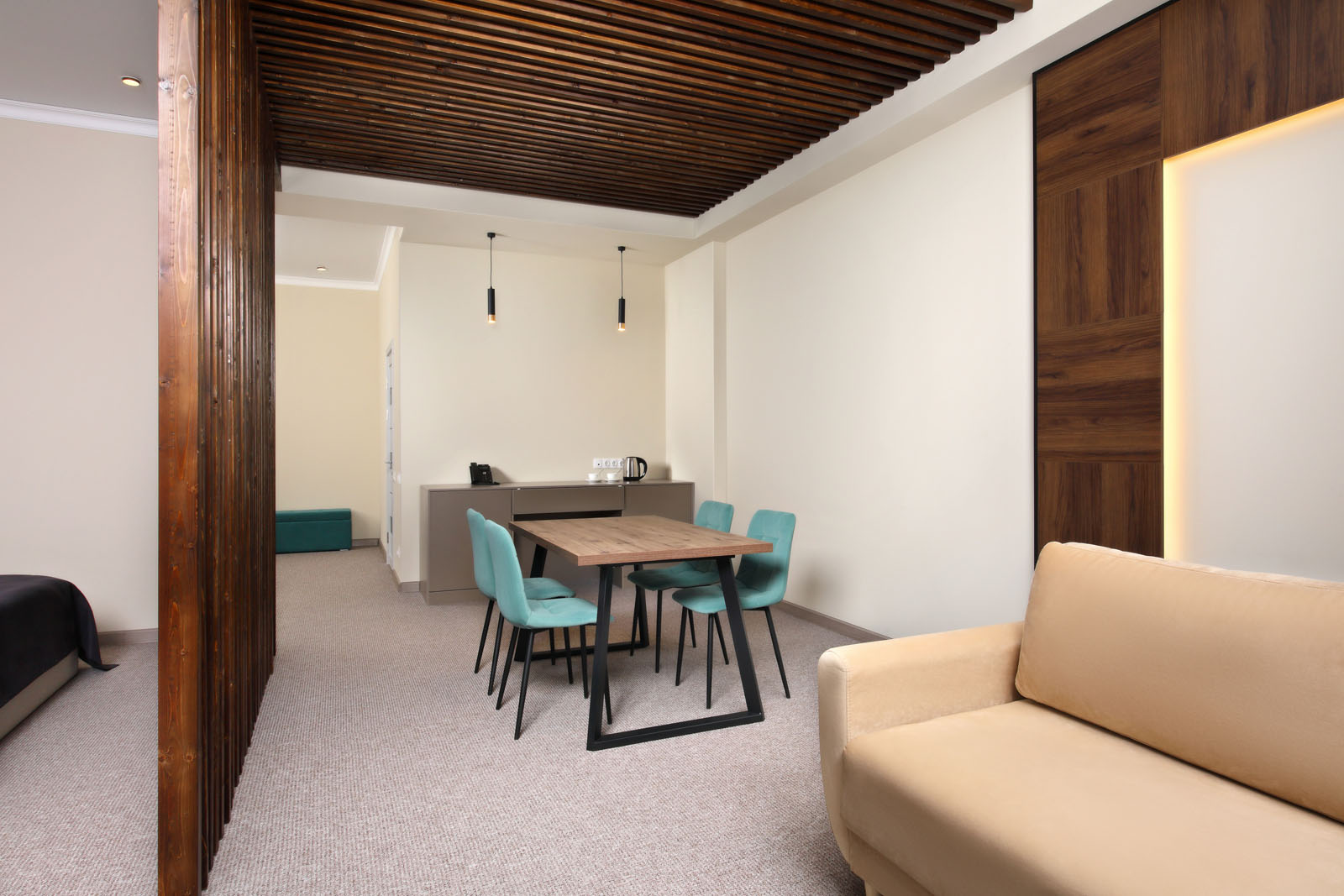 В стоимость проживания включён завтрак «шведский стол», который сервируется на красивой террасе. На 9 этаже комплекса расположен уютный ресторан, рассчитанный всего на 30 мест. Из окон открывается головокружительный вид на лесопарк и гору Бештау. В ресторане можно обедать и ужинать, а также заказать блюда в номер.