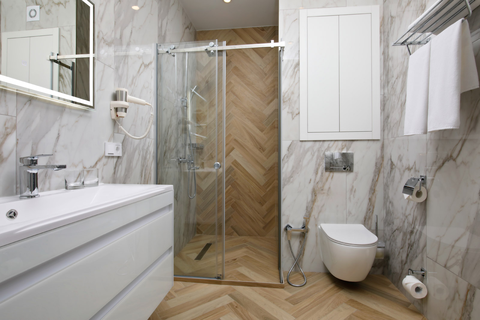 Санузел: Душ, биде/гигиенический душ, унитаз, раковина, косметические средства.