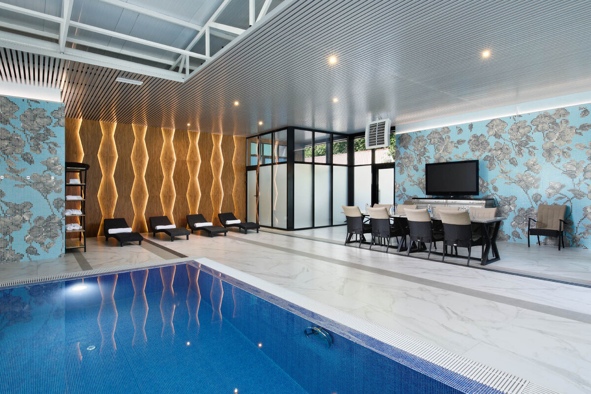 Бассейны: закрытый с гидромассажем в СПА-зоне и открытый с подогревом и подсветкой у коттеджей