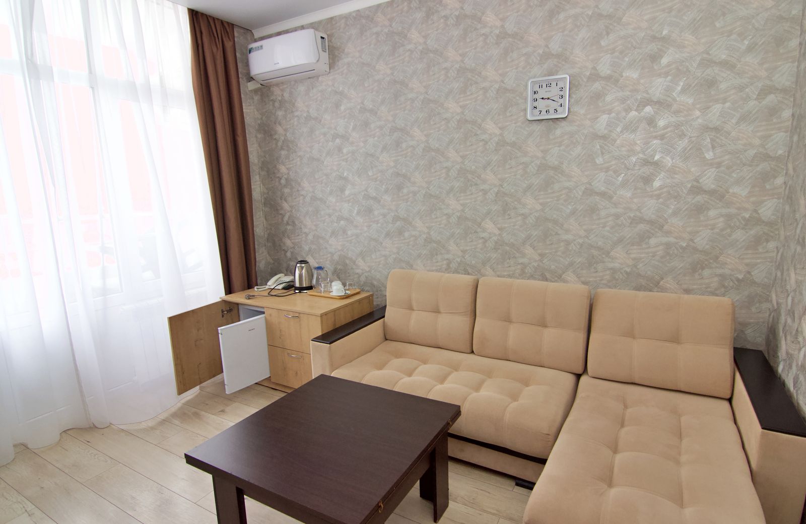 Оборудование: кондиционер, мини-холодильник, телевизор, телефон, чайный набор посуды, электрочайник.