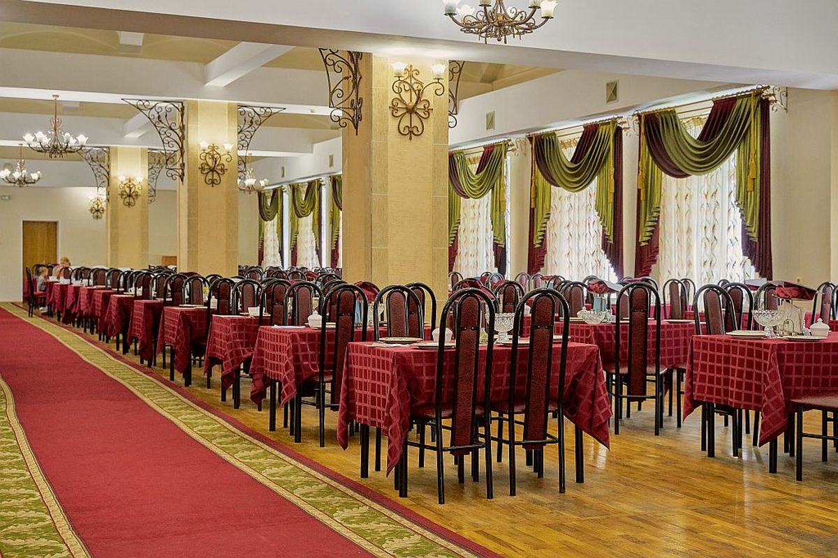 Столовая находится в отдельном здании. Рядом расположен бювет, где гости принимают минеральную воду за полчаса до еды.