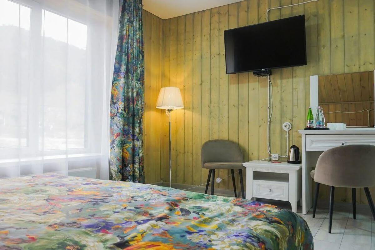Трехэтажное здание отеля находится в живописной, уединенной местности на южном склоне горы «София». Гостям предлагается выбор из 39 номеров различных категорий и нескольких уютных деревянных шале. В каждом номере оборудована ванная комната с душем, комплектом халатов, тапочек и туалетных принадлежностей. Также в номерах есть система обогрева, плазменный ТВ и электрочайник.