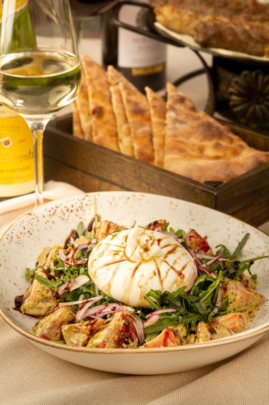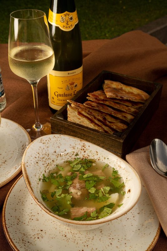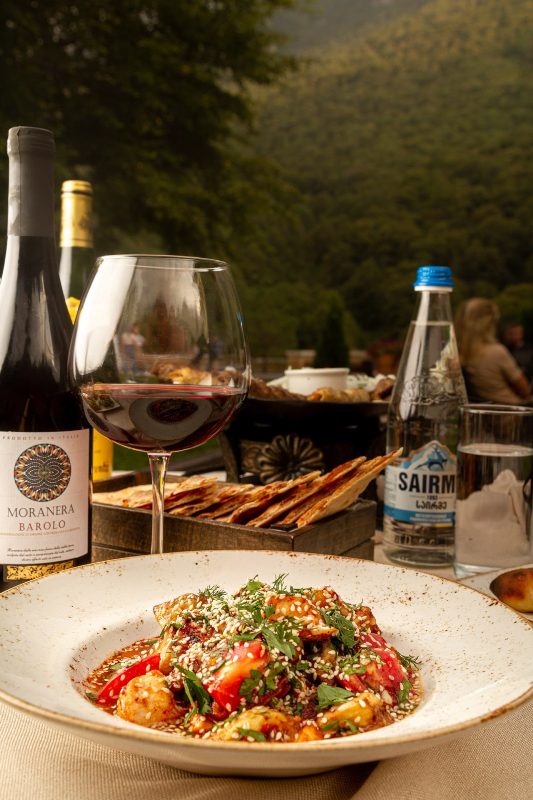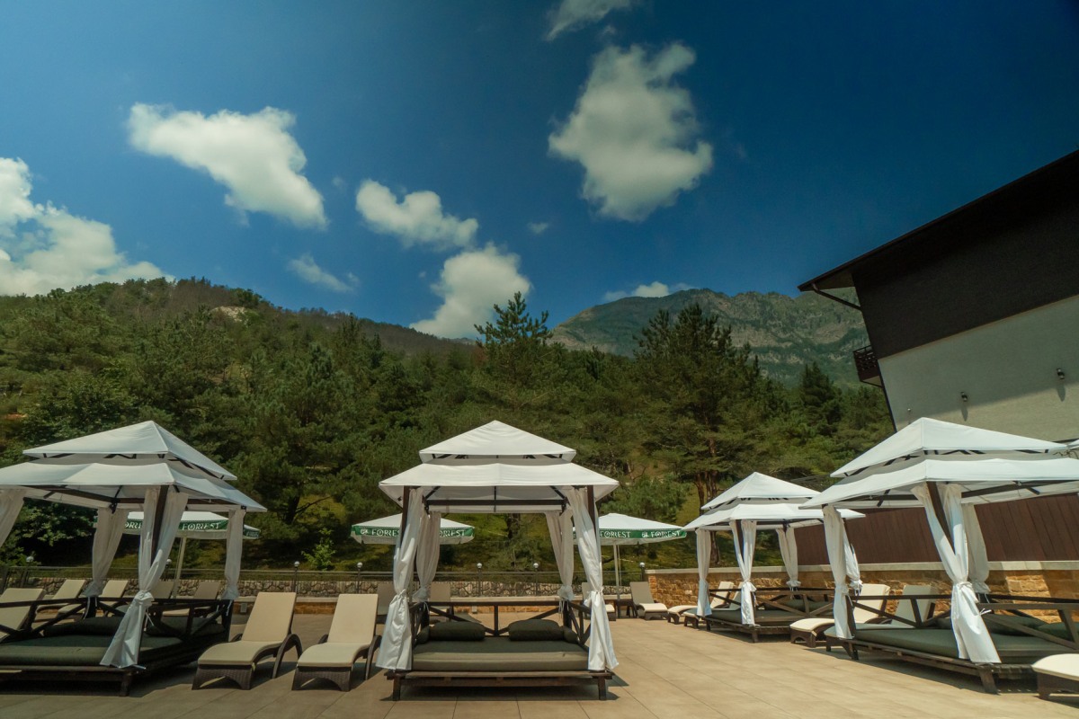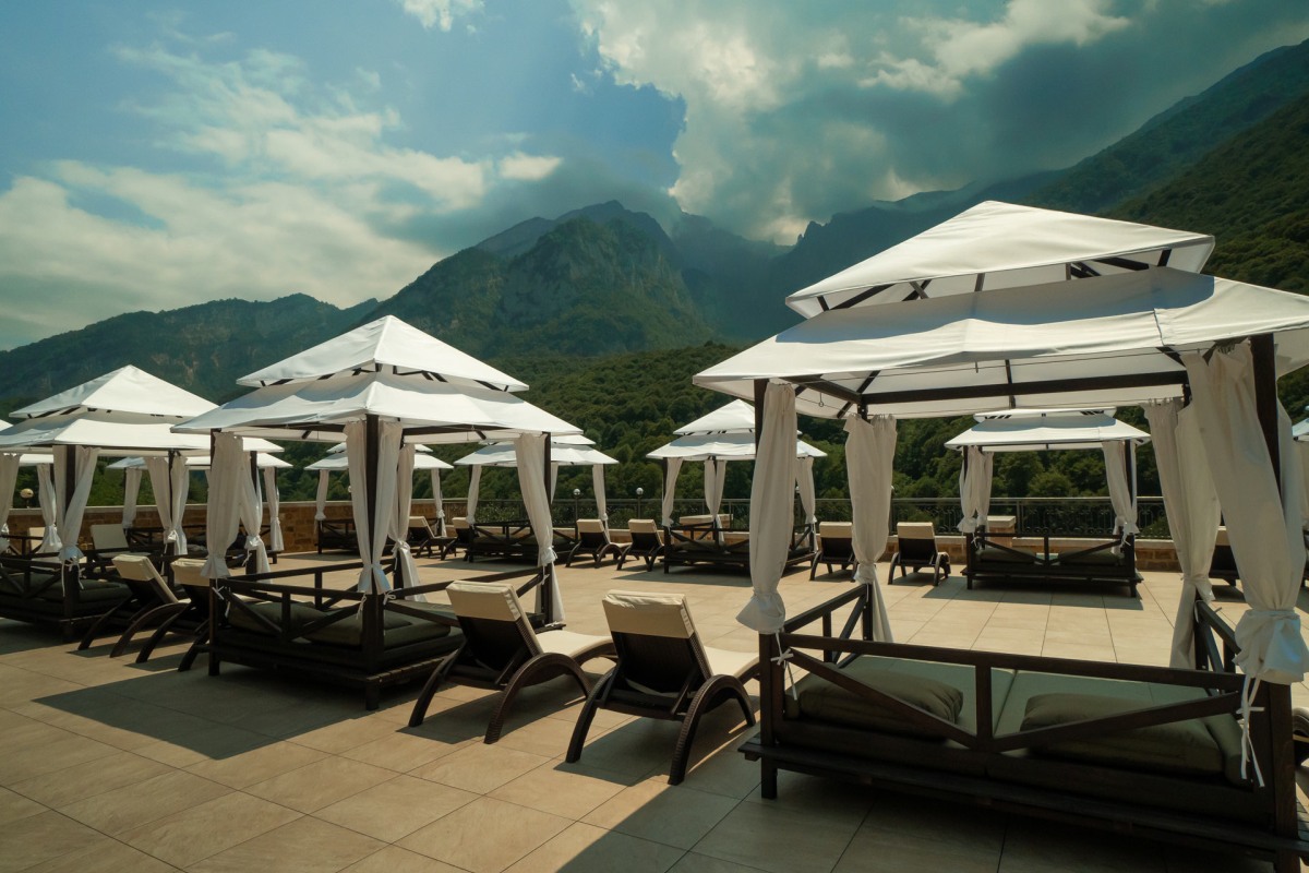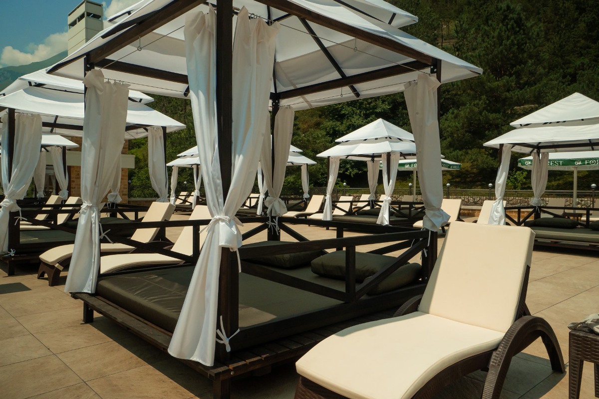 Летняя терраса бассейна предлагает уединенные бунгало, где гости могут отдохнуть под зонтами и шторками, наслаждаясь сиестой на мягких матрасах с панорамным видом на горы Осетии.