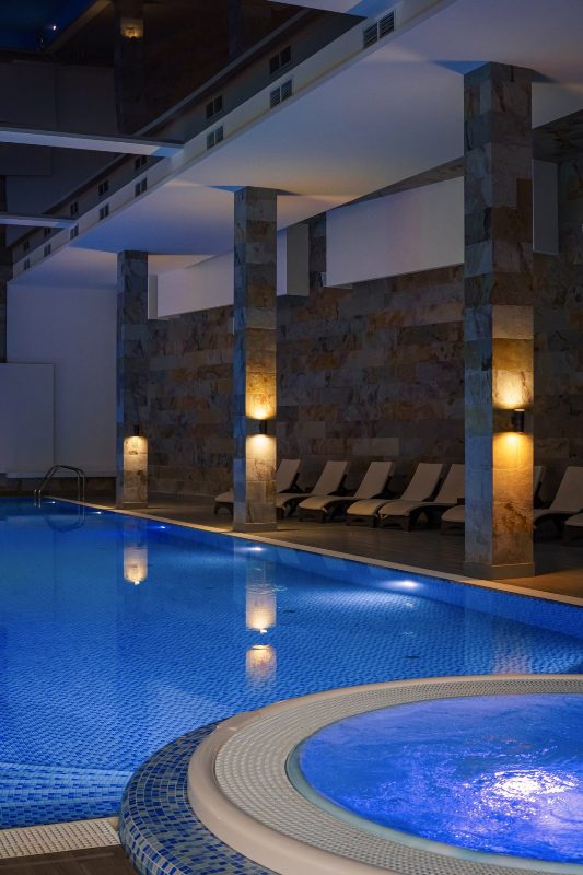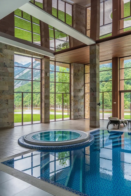 Бассейн длиной 25 метров с противотоком и гидромассажем будет идеальным местом для вашей утренней бодрости или расслабленного отдыха после SPA-процедур. На удобных шезлонгах рядом с бассейном можно наслаждаясь потрясающими видами гор.